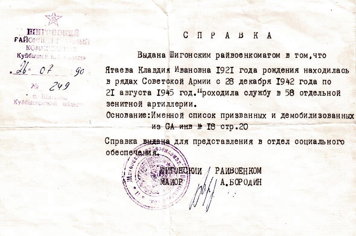 Проходила службу в рядах Красной Армии с 28 декабря 1942 г. по 21 августа 1945 г.; службу проходила в 58-й отдельной зенитной артиллерии. Умерла Платонова (Ятаева) Клавдия Ивановна 14 июля 1999 г.