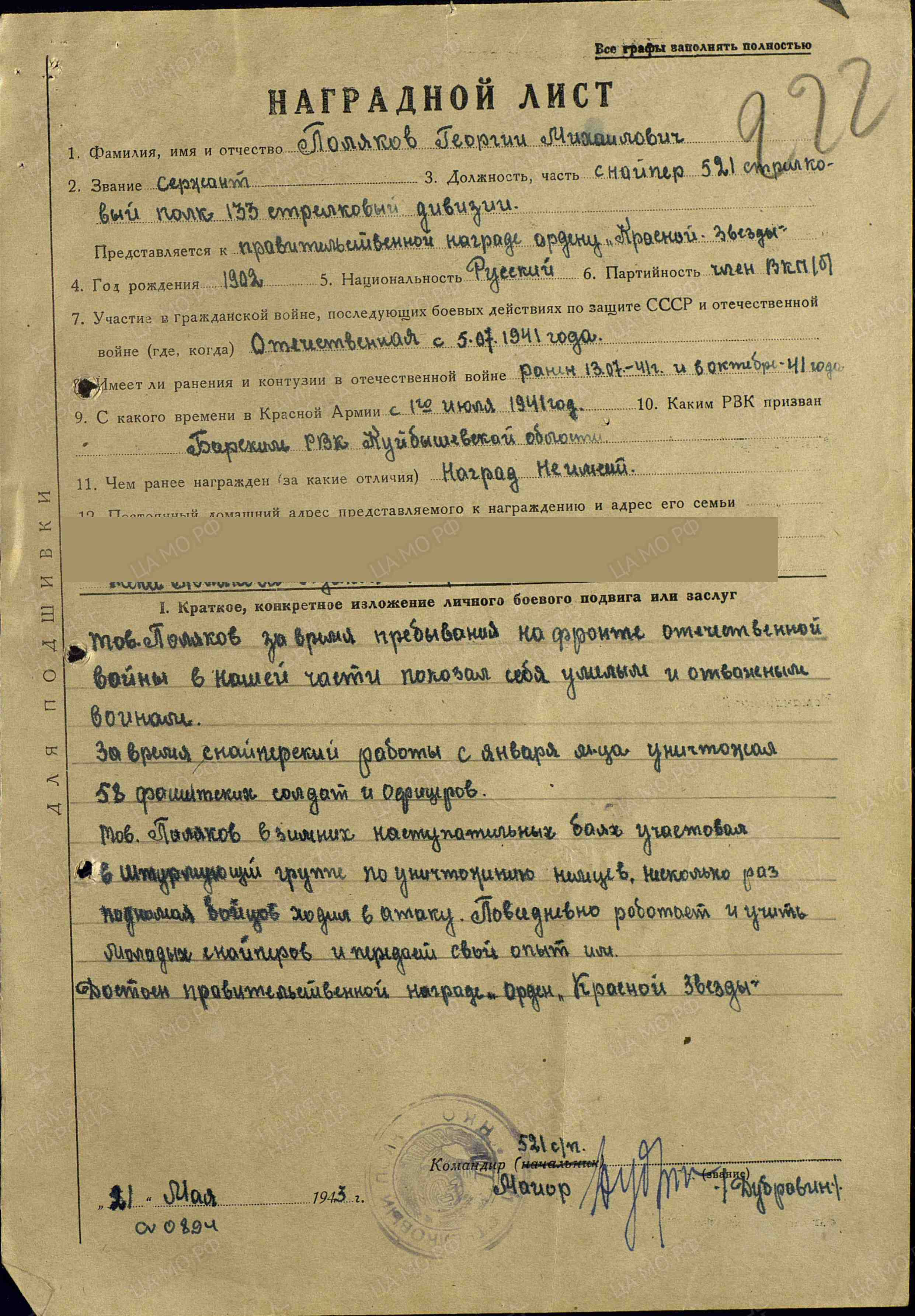 Тов. Поляков за время пребывания на фронте Отечественной войны в нашей части показал себя умелым и отважным воином. За время работы с января уничтожил 58 фашистских солдат и офицеров. Тов. Поляков в зимних наступательных боях участвовал в штурмующей группе по уничтожению немцев, несколько раз, поднимая бойцов, ходил в атаку. Повседневно работает и учит молодых снайперов и передает свой опыт им. Достоин правительственной награды - ордена Красной Звезды (наградной лист от 21.05.1943 г.).