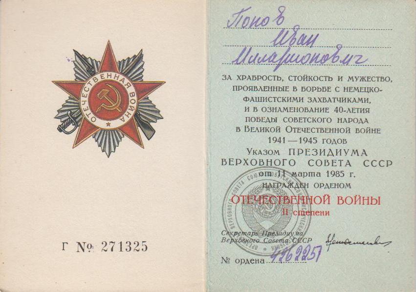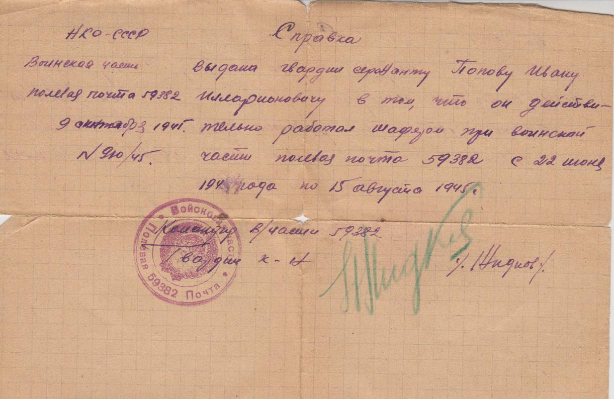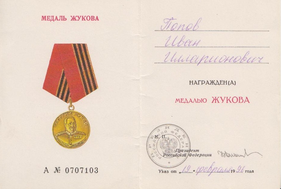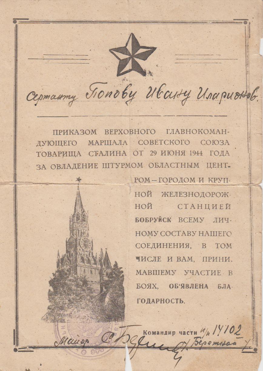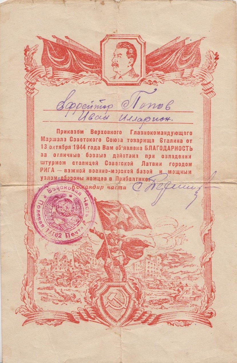 Иван Илларионович Попов родился в 1913 г. В Красной армии Иван Илларионович с сентября 1941 г., на фронте с декабря 1941 г. Служил в звании сержанта, в должности телефониста 806-го отдельного батальона связи 356-й стрелковой дивизии 1-го Белорусского фронта. Участвовал в освобождении Беларуси, Латвии, Польши, Германии. Также был шофером. Иван Илларионович был награжден медалью «За отвагу» (наградной лист от 16.01.1944 г.), медалью Жукова, орденом Красной Звезды (наградной лист от 18.02.1945 г.), орденом Отечественной войны II степени.