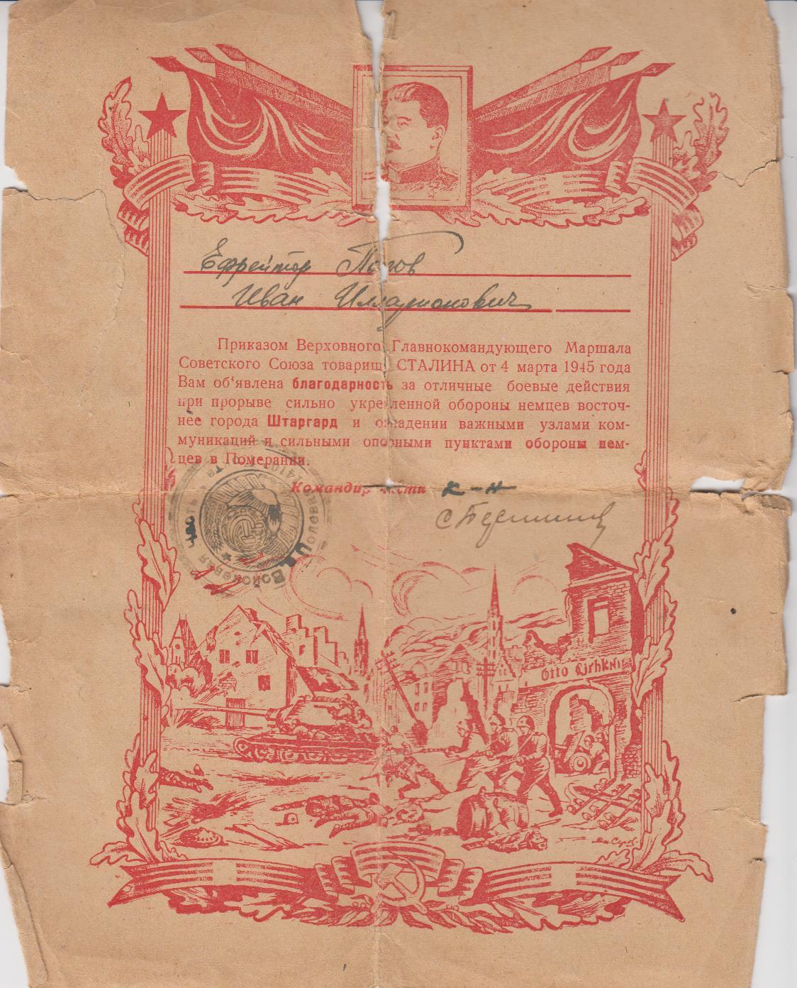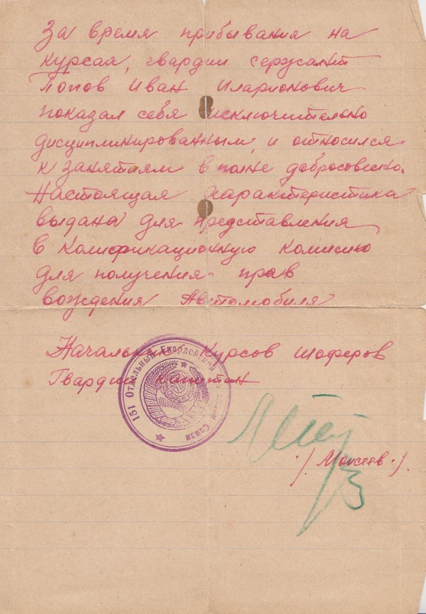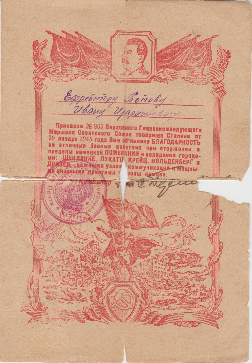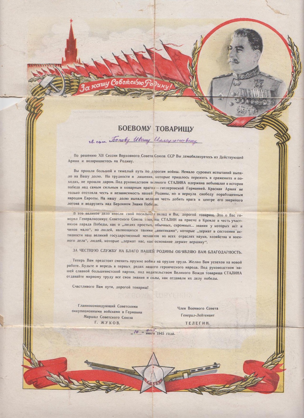 Иван Илларионович Попов родился в 1913 г. В Красной армии Иван Илларионович с сентября 1941 г., на фронте с декабря 1941 г. Служил в звании сержанта, в должности телефониста 806-го отдельного батальона связи 356-й стрелковой дивизии 1-го Белорусского фронта. Участвовал в освобождении Беларуси, Латвии, Польши, Германии. Также был шофером. Иван Илларионович был награжден медалью «За отвагу» (наградной лист от 16.01.1944 г.), медалью Жукова, орденом Красной Звезды (наградной лист от 18.02.1945 г.), орденом Отечественной войны II степени.