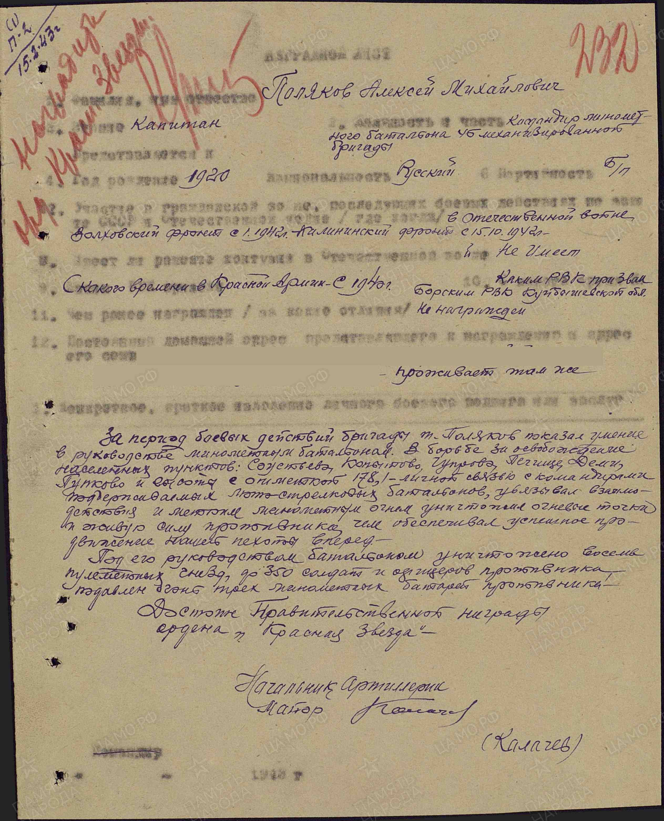 За период боевых действий бригады тов. Поляков показал умение в руководстве минометным батальоном. В борьбе за освобождение населенных пунктов Соустьево, Копытово, Чупрово, Печище, Деми, Пупково и высоты с отметкой 178,1 личной связью с командирами поддерживаемых мотострелковых батальонов, увязывал взаимодействия и метким минометным огнем уничтожил огневые точки и живую силу противника, чем обеспечивал успешное продвижение нашей пехоты вперед. Под его руководством батальоном уничтожено восемь пулеметных гнезд, до 350 солдат и офицеров противника, подавлен огонь трех минометных батарей противника. Достоин правительственной награды – ордена Красной Звезды (наградной лист от 9.02.1943 г.).