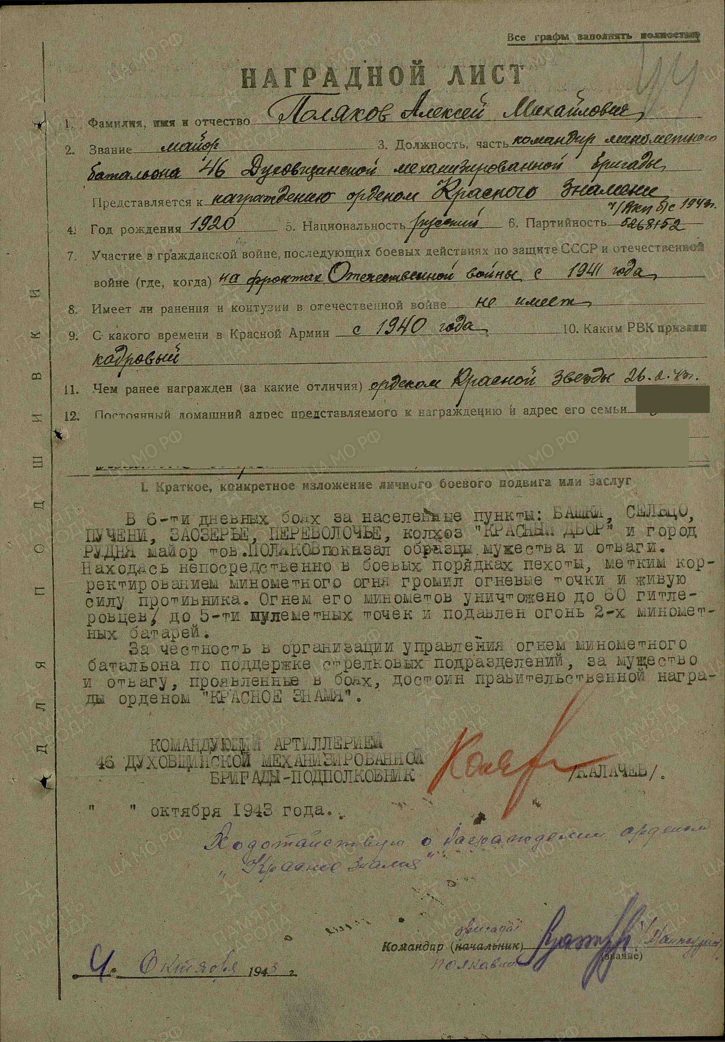 В шестидневных боях за населенные пункты Башки, Сельцо, Пучени, Заозерье, Переволочье, колхоз «Красный Двор» и г. Рудня майор тов. Поляков показал образцы мужества и отваги. Находясь непосредственно в боевых порядках пехоты, метким корректированием минометного огня громил огневые точки и живую силу противника. Огнем его минометов уничтожено до 60 гитлеровцев, до 5 пулеметных точек и подавлен огонь 2-х минометных батарей. За честность в организации управления огнем минометного батальона при поддержке стрелковых подразделений, за мужество и отвагу, проявленные в боях, достоин правительственной награды – ордена Красного Знамени (награжден орденом Отечественной войны II степени; наградной лист от 4.10.1943 г.).