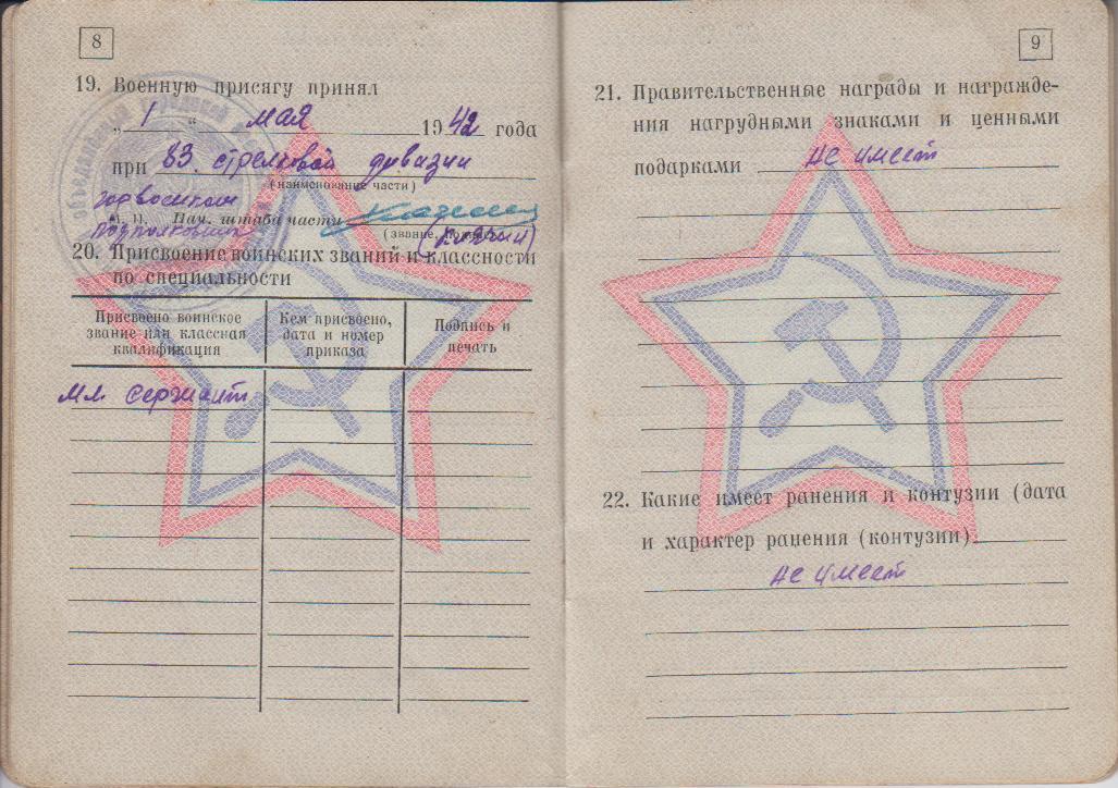 В Красной Армии с марта 1942 г. С января по декабрь 1943 г. служил в звании младшего сержанта, в должности командира стрелкового отделения 83-й стрелковой дивизии.