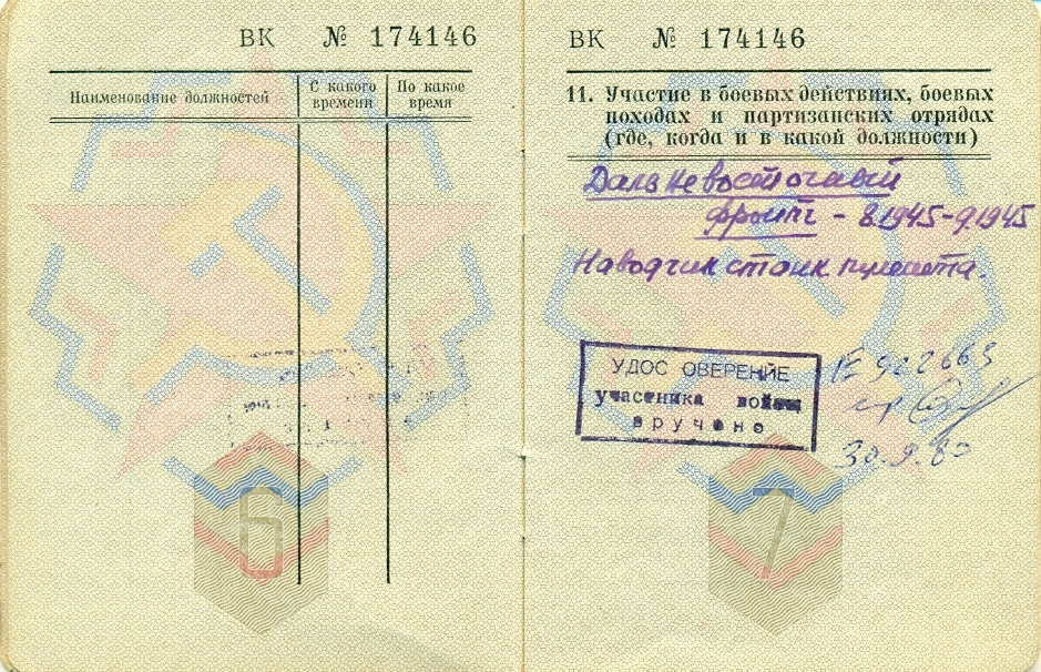 Иван Никифорович Калябин родился 26 июня 1926 года в селе Дубровка Хворостянского района, в 15 лет уже был молотобойцем в кузнице, а в 17 лет, в 1943-м, был призван в армию. Их эшелон отправлялся прямиком на Дальний Восток, где новобранцев обучали военному делу. В Комсомольск-на-Амуре добирались по узкоколейке, через снежный тоннель высотой в два метра. А в августе 1945-го командир дал команду построиться и сообщил, что началась война с Японией. Учеба закончилась, солдатам выдали боевые патроны, гранаты. На пароходах держали курс на Южный Сахалин. Не доплыв трех километров до берега, были обстреляны японцами, нанесли ответный удар. Иван Никифорович, как наводчик танкового пулемета, находился в самой зоне обстрела. Бой длился час, японцы отступили. После небольшой передышки поплыли по заданному курсу, но воевать уже было не с кем – Япония капитулировала. Служил в армии до 1950 г. В политотделе ему предложили организовать работу райкома комсомола. Через год – отпуск. Здесь, в своем родном Хворостянском районе, он и встретился с Зинаидой Ивановной. Уезжал назад уже с ней. В 1954 г. вернулись в родные края. В с. Белозерки Красноярского района работал в совхозе им. Дзержинского, секретарем парторганизации. Был награжден орденом Отечественной войны II степени. Иван Никифорович Калябин находится на заслуженном отдыхе, проживает в с. Белозерки.