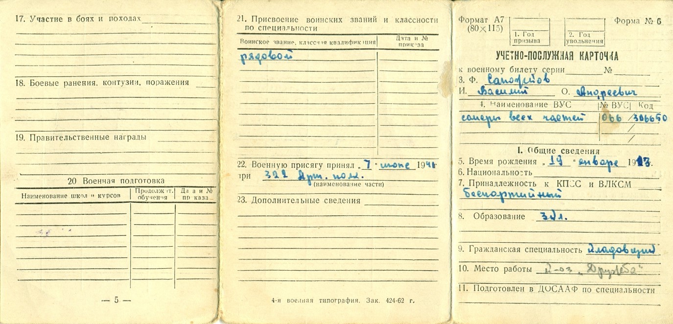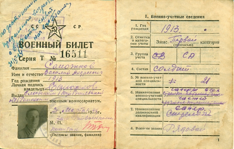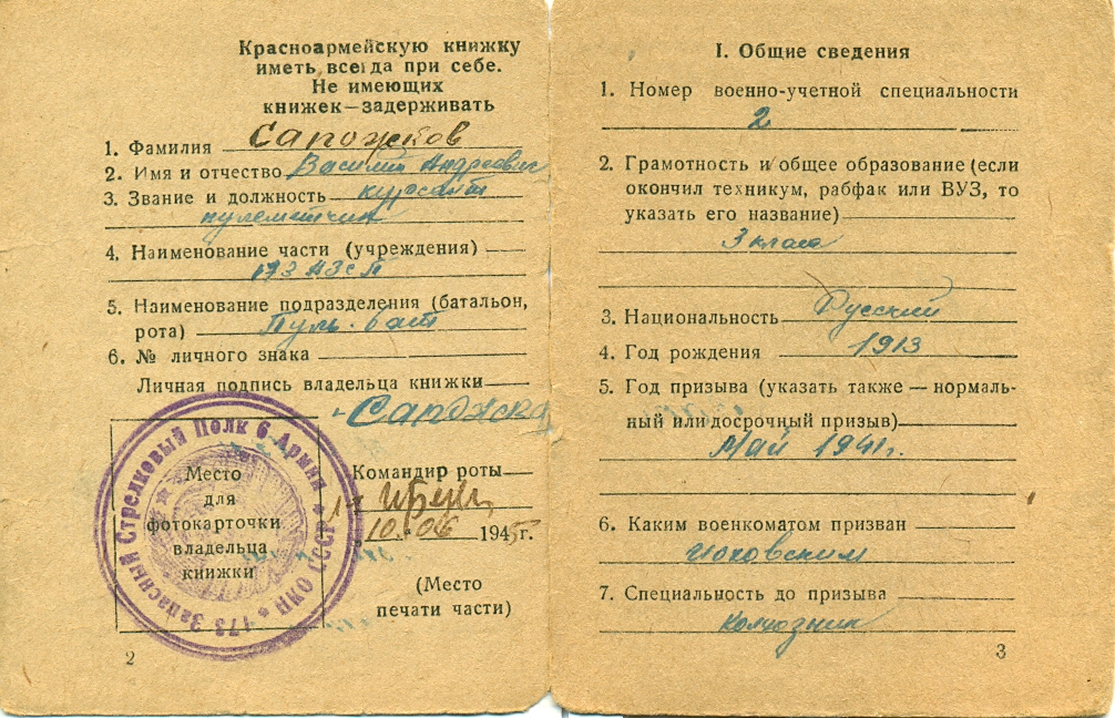 Василий Андреевич Сапожков родился в 1913 году в селе Ивановка Сергиевского района Куйбышевской области.