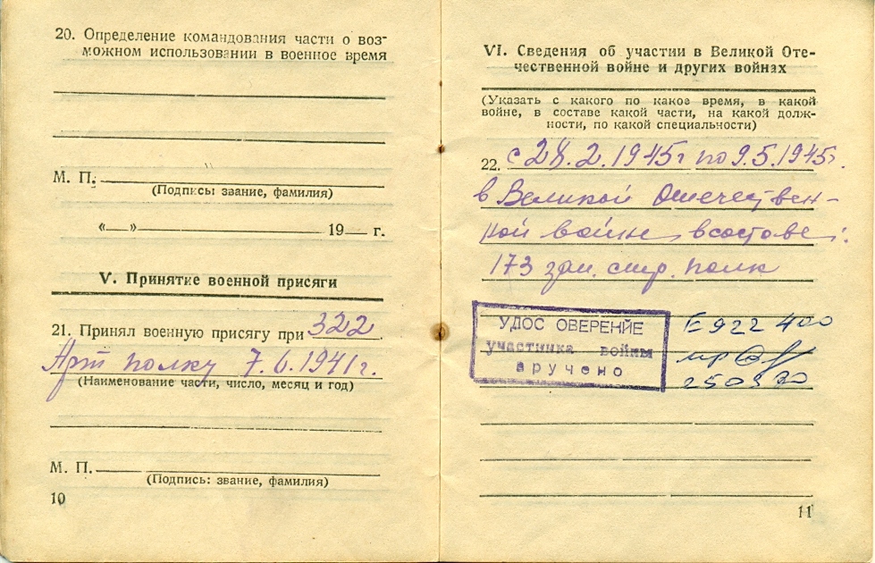 С 5 мая по июнь 1941 г. служил телефонистом в 322-м артиллерийском полку, где его и застала война. Затем с июня по ноябрь 1941 г. воевал в 155-й стрелковой дивизии. Оказался в плену в Германии, в котором находился с ноября по февраль 1945 г. После освобождения из плена продолжил войну с немецкими захватчиками в составе 3-го трофейного батальона и 173-го стрелкового полка.