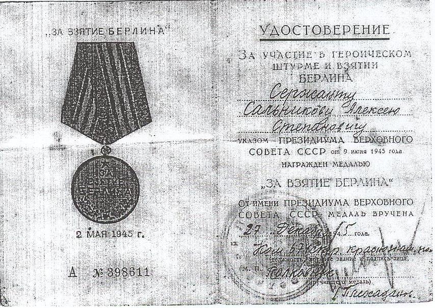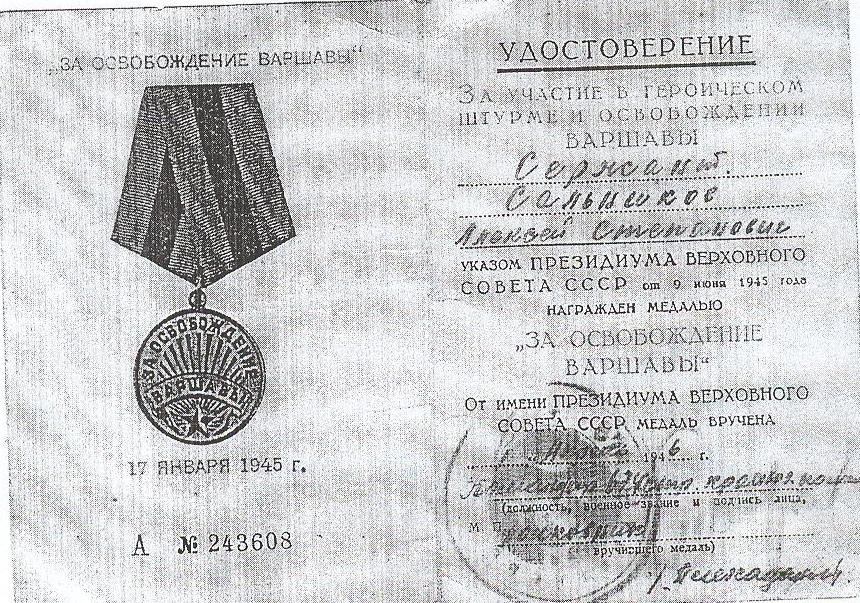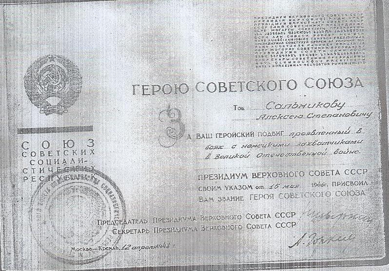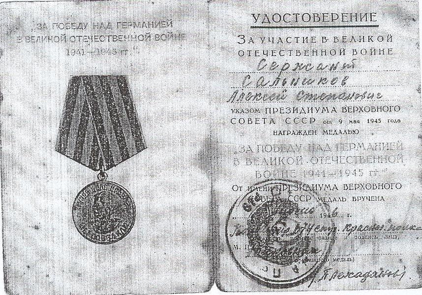 В 1940 г. Алексей Степанович был призван в армию. Служил на Японо-Маньчжурской границе в 105-м артиллерийском полку. В конце 1941 г. их полк был выведен в Сибирь. Здесь была сформирована 144-я отдельная курсантская бригада. В Сибири Алексей Степанович окончил курсы артиллеристов и связистов, после чего его отправили в Подмосковье. Отсюда и начался его военный поход. Прошел Алексей Степанович Литву, Латвию, Эстонию, Польшу, Чехословакию. Дошел до Берлина. Был три раза ранен, контужен. 30 апреля 1945 г. начался штурм Рейхстага, в котором принимала участие и бригада «Сибирские войска», где служил Алексей Сальников. За штурм Рейхстага Алексею Степановичу было присвоено звание Героя Советского Союза.