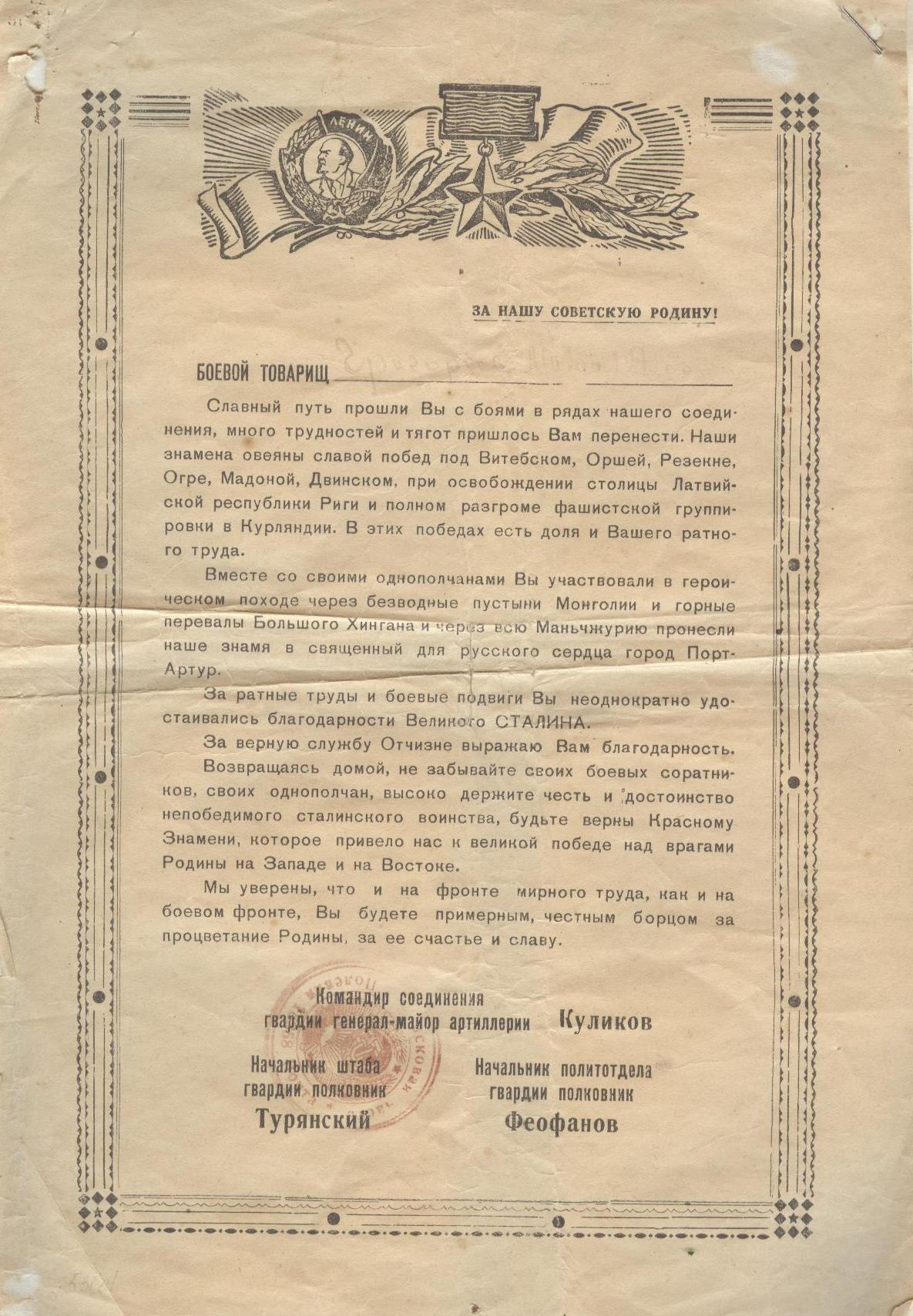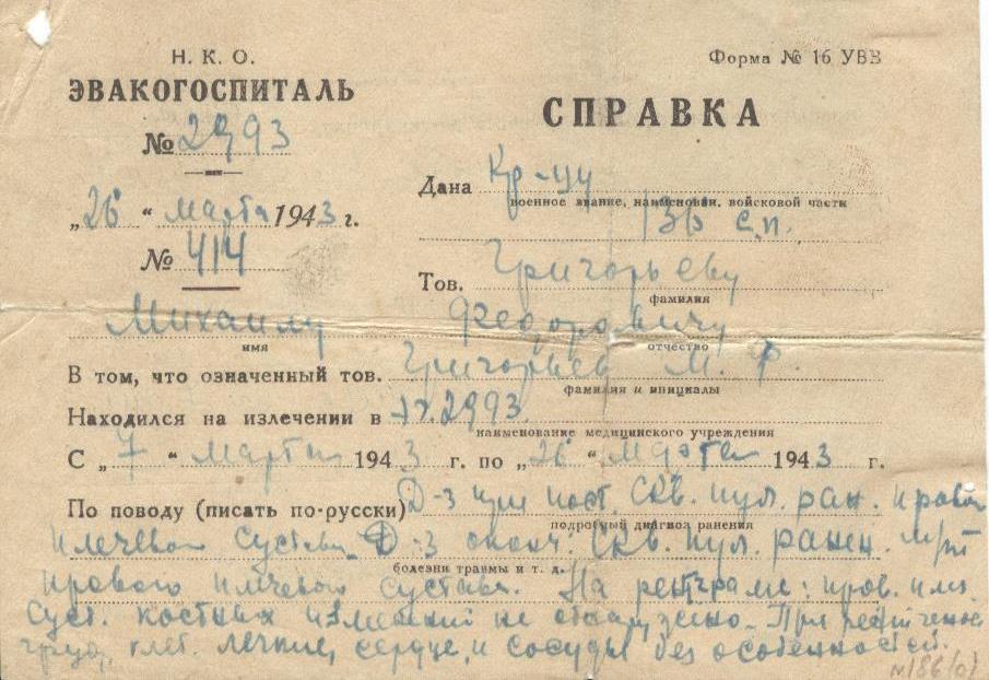 С апреля 1945 г. фронт был упразднен, а его войска переданы в состав Ле-нинградского фронта. После излечения Михаил был направлен на Ленинградский фронт, который был сформированной на базе 2-го Прибалтийского фронта. По приказу командования в августе 1945 г. войска в очередной раз были переброшены на Забайкальский фронт. После завершения боевых действий против Японии младший сержант Григорьев Михаил 15 октября 1946 г. вернулся в родное село.