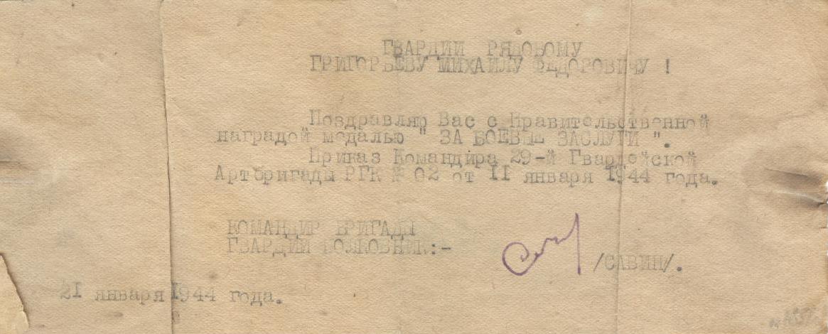 «8 сентября 1943 г. в боях за г. Смоленск, под сильным артиллерийским огнем про-тивника устранил 28 порывов линии, обеспечив батарею бесперебойной связью, в результате чего батарея подавила огонь двух батарей противника и рассеяла и частично уничтожила до роты пехоты противника. 24 декабря 1943 г., во время боев на Витебском направлении, под сильным артиллерийским и минометным огнем противника обеспечил бесперебойную связь НП с огневой позицией, устранил 33 порыва телефонной линии, в результате чего батарея отразила контратаку до роты пехоты противника и обеспечила своим огнем захват высоты 222,1. Достоин правительственной награды – медали «За боевые заслуги» (наградной лист от 10.01.1944 г.)».