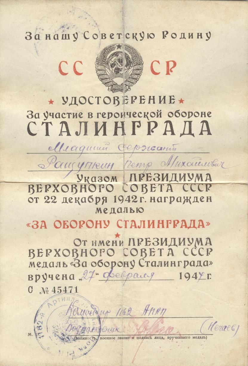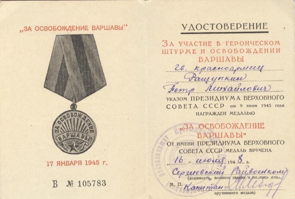 Петр Михайлович был награжден орденом Красной Звезды, орденом Отечественной войны II степени, медалями «За победу над Германией в Великой Отечественной войне 1941-1945 гг.», «За оборону Сталинграда», «За освобождение Варшавы», «За взятие Берлина», «За отвагу». Информация сайта podvignaroda.ru: «Наградить медалью «За отвагу» телефониста 3-й батареи Ращупкина Петра Михайловича за то, что он 12 октября 1942 г. на протяжении дня шесть раз восстанавливал связь с НП командира батареи под сильным огнем немецких минометов. 19 октября 1942 г., при восстановлении связи в непосредст-венной близости от просачивающихся немецких автоматчиков, тов. Ращупкин был обстрелян из автомата. Двигаясь ползком до места порыва и обратно на НП, Ращупкин честно выполнил свой долг, связь была восстановлена. В результате добросовестной работы телефониста Ращупкина батарея в этот день подавила НП противника. Ращупкин показал себя дисциплинированным, храбрым и отлично знающим свое дело бойцом (наградной лист от 9.04.1943 г.)».