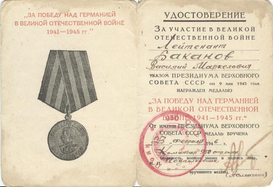 «Телефонист Баканов В.М. при прорыве вражеской обороны 23-26 июня 1944 г. в районе Городьково, Трубачи показал себя смелым, решительным и храбрым телефонистом. Под сильным артиллерийско-минометным огнем противника обеспечил бесперебойную связь командного пункта командира полка с наступающими подразделениями. При повреждении линии связи через реку Лучеса тов. Баканов, под сильным артиллерийским огнем противника вплавь проложил новую линию связи и исправил до 40 повреждений. Тов. Баканов своими действиями обеспечивал бесперебойную связь и способствовал выполнению поставленной боевой задачи. Достоин награды – ордена Отечественной войны I степени (наградной лист от 08.08.1944 г.)».