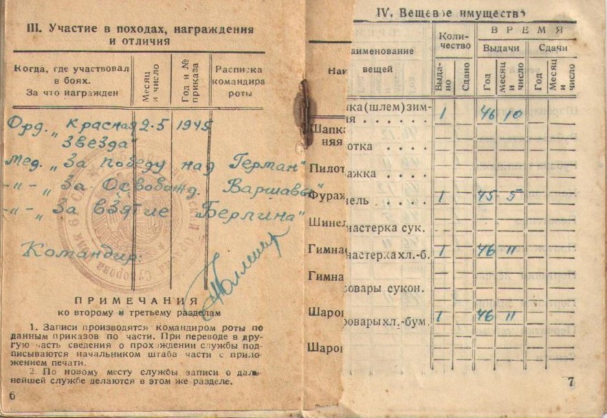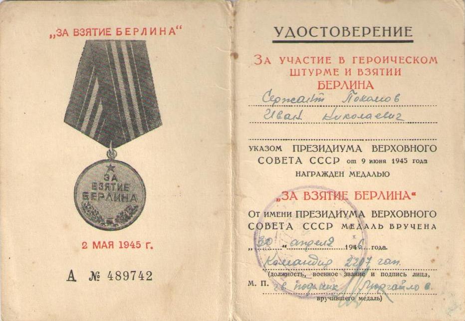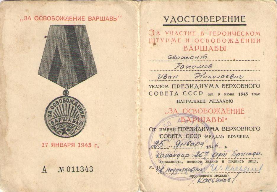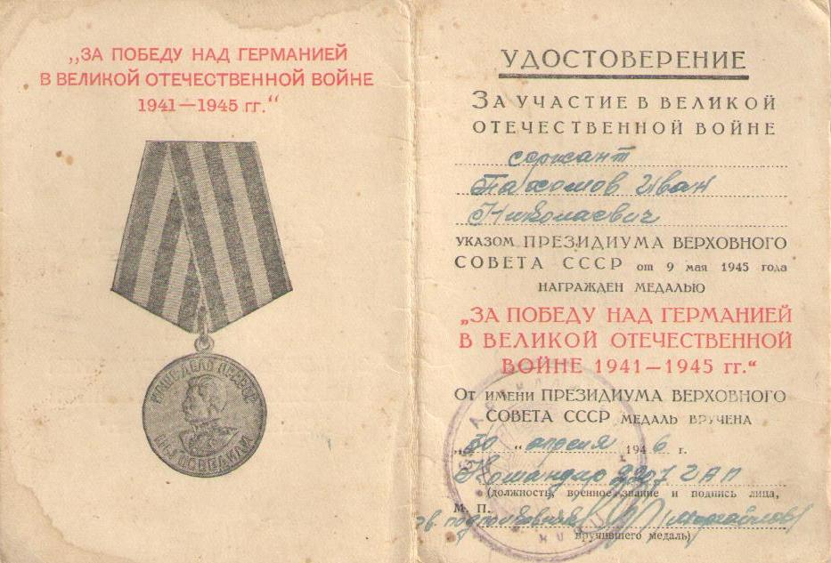 Иван Николаевич демобилизовался в 1945 г. Был награжден медалями «За освобождение Варшавы», «За взятие Берлина», «За победу над Германией в Великой Отечественной войне 1941-1945 гг.», орденом Отечественной войны II степени, орденом Красной Звезды. Информация сайта podvignaroda.ru: «На фронтах Отечественной войны с 1942 г. в составе 36-й гвардейской стрелковой ди-визии в должности сапера, участник боев под Белградом, где под огнем артиллерии противника проделал 2 прохода в проволочном заграждении и обезвредил 350 мин, участник боев за г. Брест, где под сильным артогнем исправил 10 порывов связи, связь работала бесперебойно. В этом бою был ранен. Находясь в учебном артиллерийском дивизионе в должности курсанта, тов. Пахомов отлично овладевает знаниями. Дисциплинирован. Достоин правительственной награды – медали «За отвагу» (наградной лист от 29.05.1945 г.; награжден орденом Красной Звезды)».