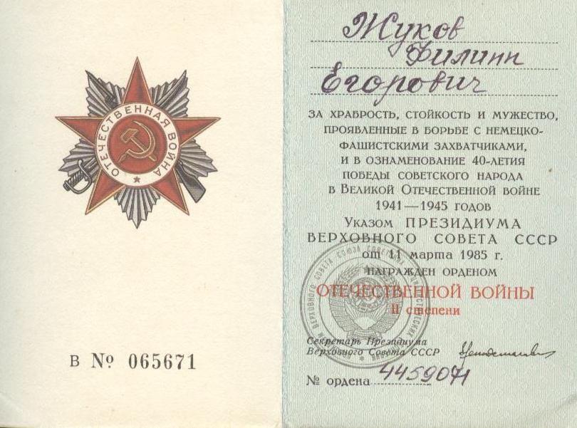 Филипп Егорович Жуков родился 20 февраля 1920 году в деревне Коржевка Исаклинского района. Окончил 4 класса школы в 1938 г. Гражданская специальность – токарь.