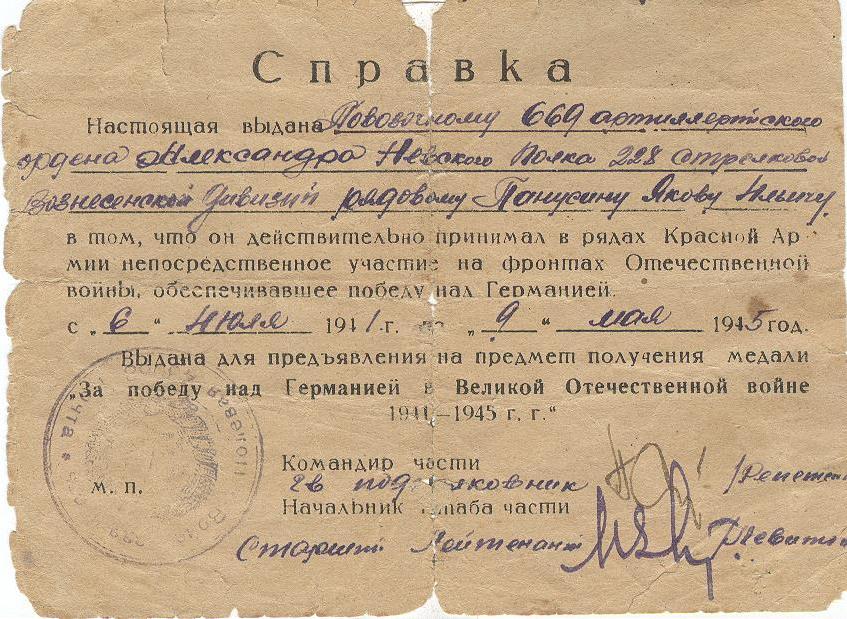 «Наградить медалью «За отвагу» рядового Панусина Якова Ильича за то, что он за период наступательных боев показал себя как преданный и мужественный воин. В боях за удержание плацдарма на правом берегу реки Тиса тов. Панусин, под сильным ружейно-пулеметным и минометным огнем противника доставлял боеприпасы на огневые позиции батареи, стоящей на прямой наводке, благодаря чему батареей отбито пять контратак пехоты противника (наградной лист от 27.11.1944 г.)».