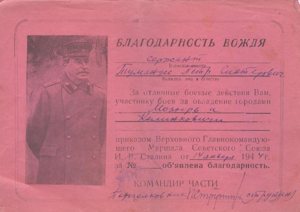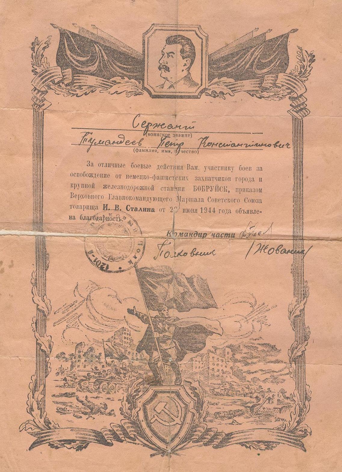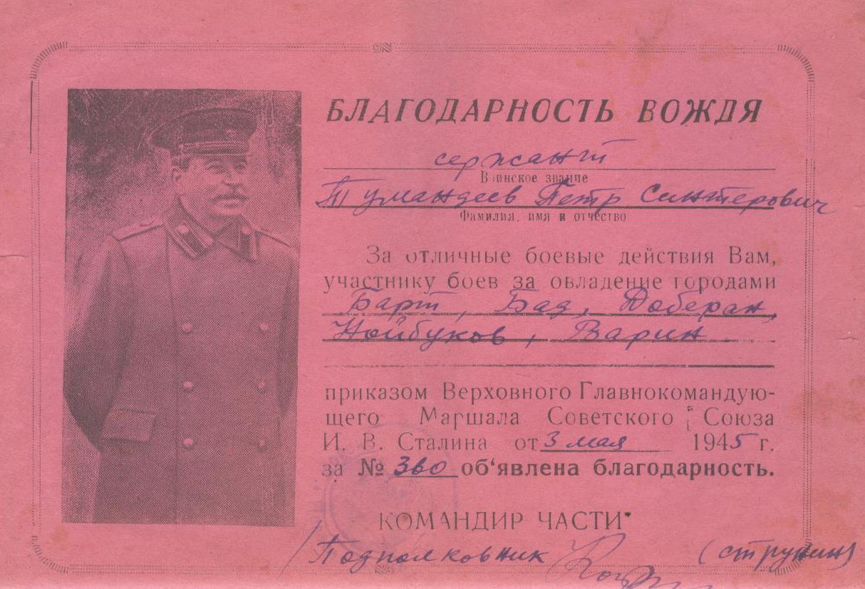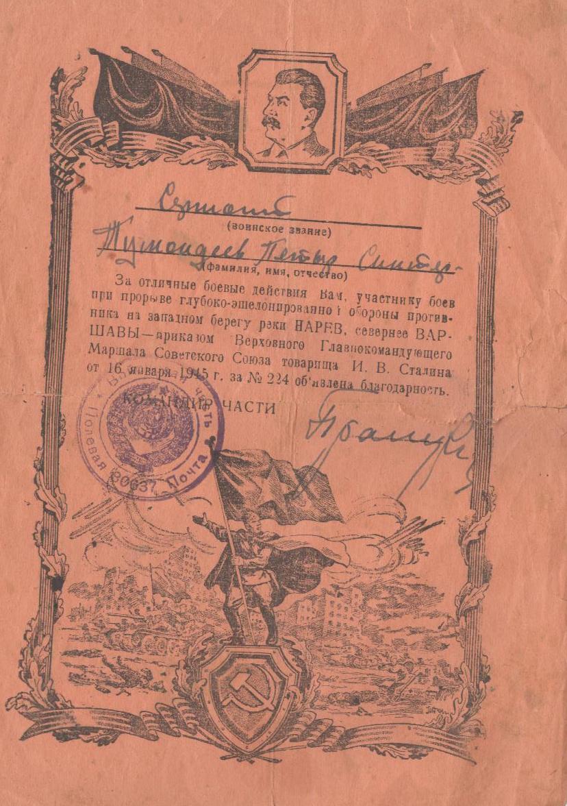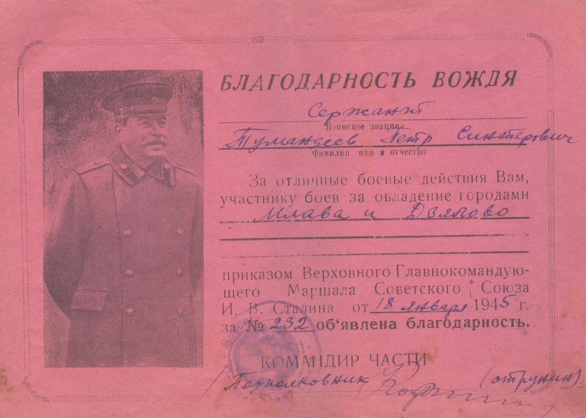 Когда началась война, три его старших брата ушли на фронт (Николай и Федор погибли, защищая Родину, а Василий вернулся домой живым). Петру в начале войны было 16 лет, но он, видя, какие зверства творят фашисты на нашей земле, тоже хотел попасть в действующую армию, и попал… Мелекесским РВК Ульяновской области он был призван и воевал в 354-й стрелковой Калинковичской ордена Ленина Краснознаменной ордена Суворова дивизии армии Рокоссовского (2-й Белорусский фронт). Освобождал Белоруссию, Польшу, Германию. В 15-ти благодарностях от вождя виден его солдатский путь.