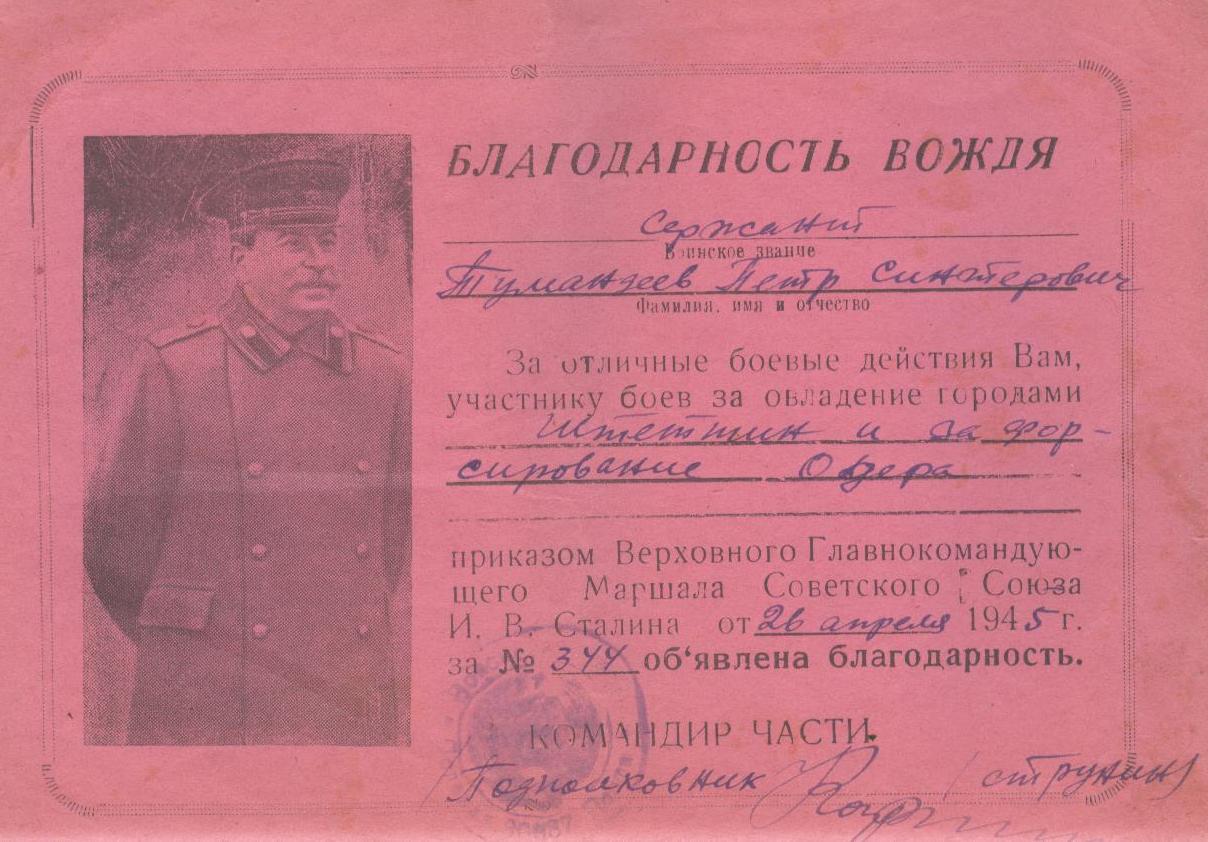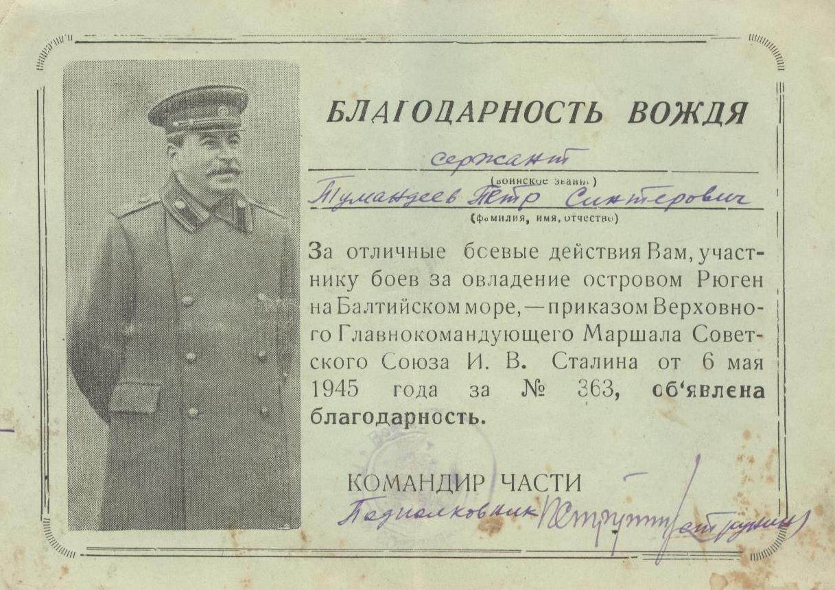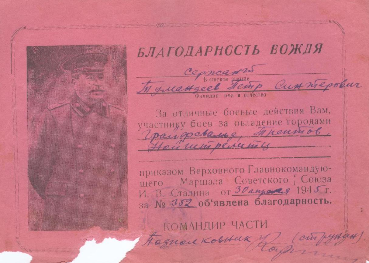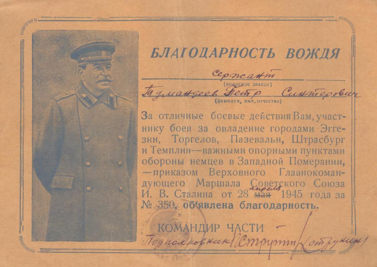 «Тумандеев Петр Сентерович родился 12 июля 1925 года в селе Чувашское Урметьево Челно-Вершинского района в многодетной семье.