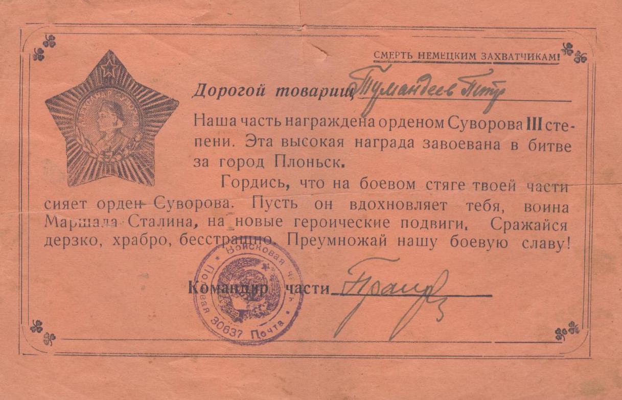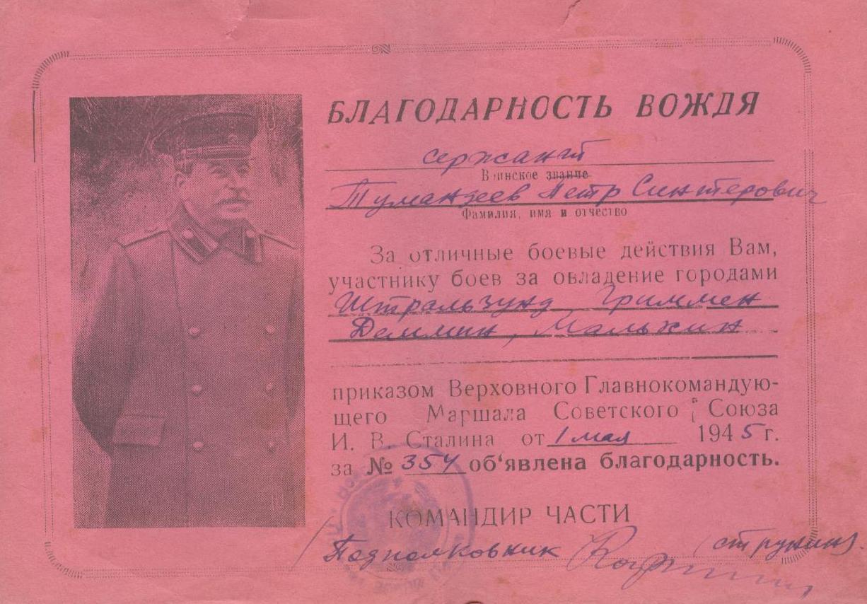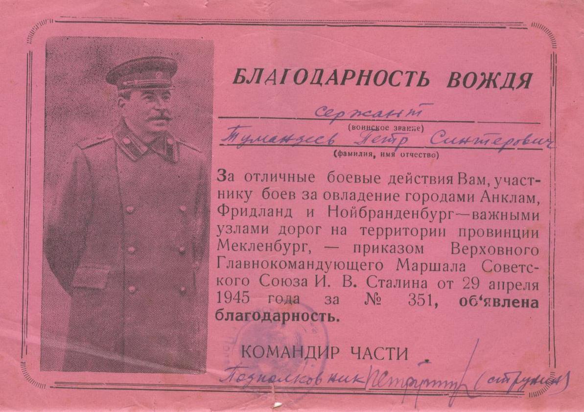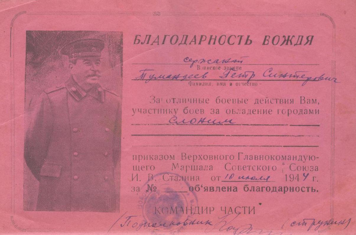 «Тумандеев Петр Сентерович родился 12 июля 1925 года в селе Чувашское Урметьево Челно-Вершинского района в многодетной семье.
