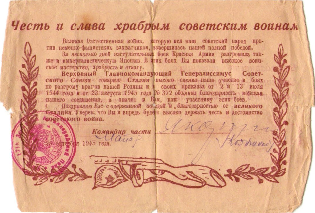 Проходил службу в 85-м запасном стрелковом полку в 1944 г., на 1-ом Дальневосточном фронте с 8 августа по 3 сентября 1945 г. Демобилизован 28 августа 1945 г.