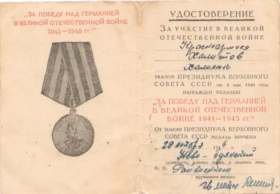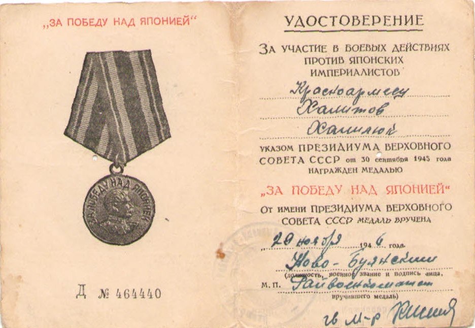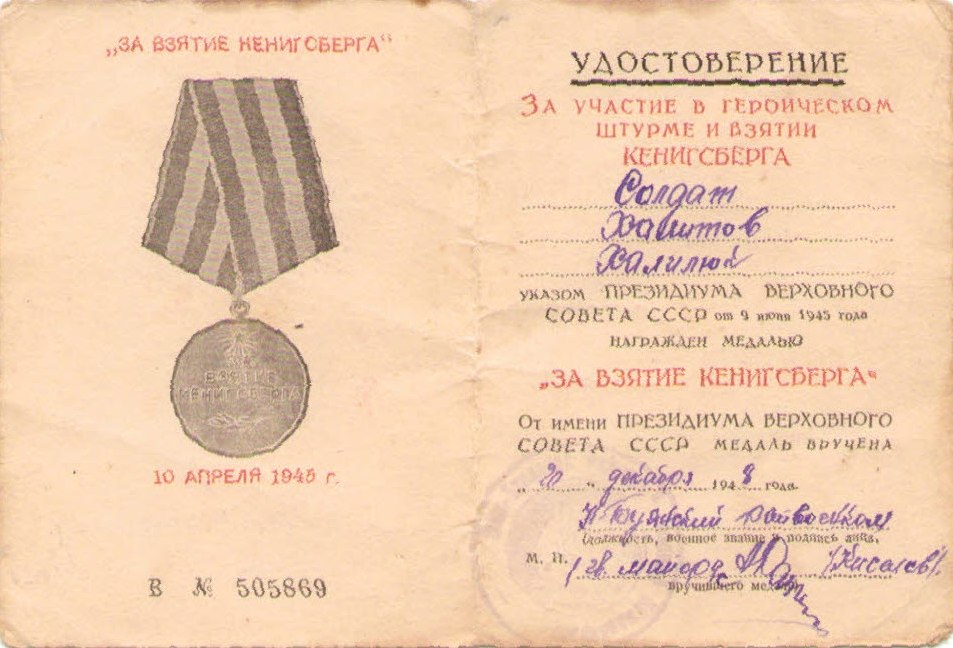 Халилюк Халитов был награжден медалями «За отвагу», «За взятие Кенигсберга», «За победу над Германией в Великой Отечественной войне 1941–1945 гг.», «За победу над Японией».