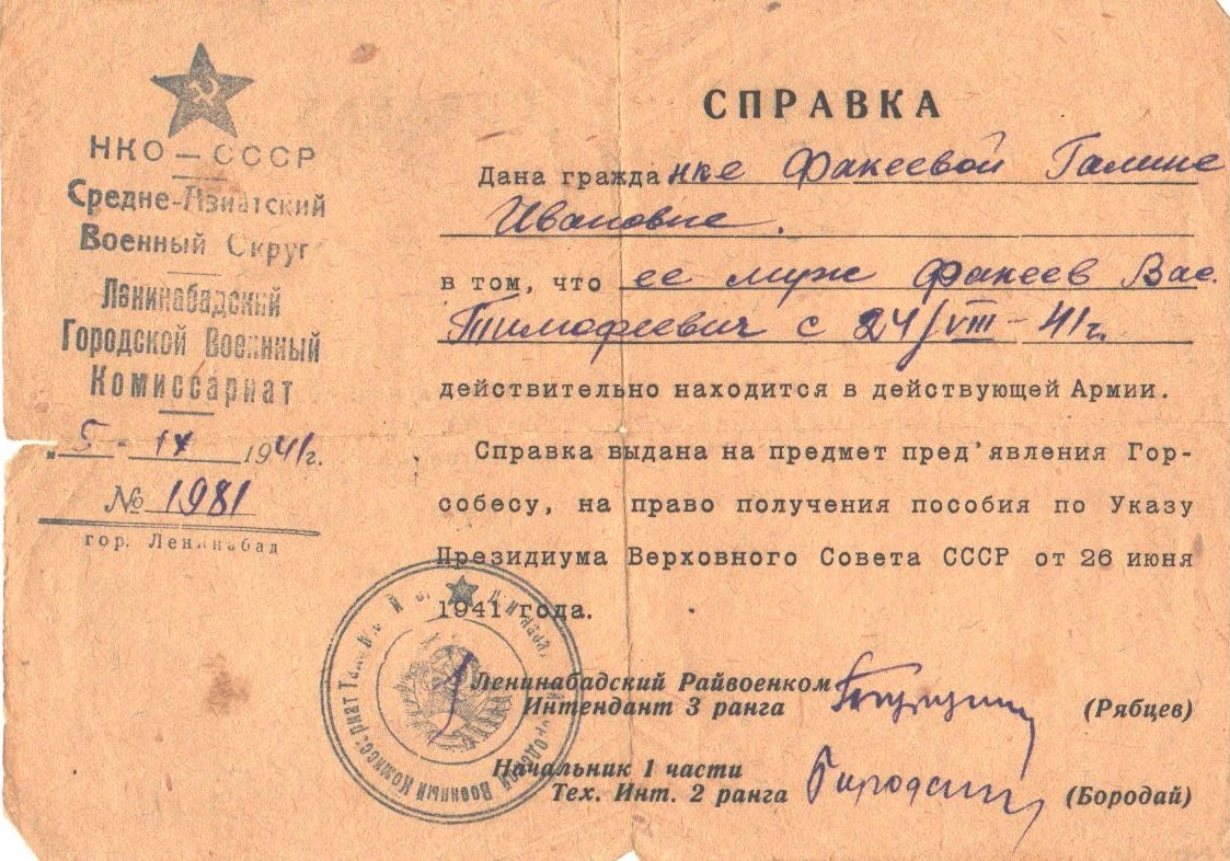 В 20 летнем возрасте Галина завербовалась с девчатами и уехала в Ленинабад. С 1933 г. по 1940 г. работала в детском доме №1 тех. служащей и помощником повара, затем – на консервном заводе. В Ленинабаде познакомилась с Фокеевым Василием Тимофеевичем (03.01.1906–03.08.1966) и вышла за него замуж, расписались 9 ноября 1936 г.