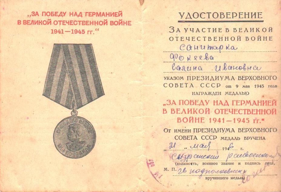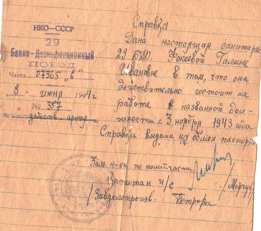 Проводив мужа на фронт, Галина вернулась в совхоз «Большевик». С 6 декабря 1941 г. по 2 ноября 1943 г. работала трактористом 2-ой категории, одновременно обучаясь с девчатами на курсах трактористов. С 3 ноября 1943 г. по 1944 г. Галина Ивановна – санитарка в 29-м банно-прачечно-дезинфекционном поезде, часть 07365 «в» действующей армии. Мыли раненых, стирали гимнастерки. Затем работала санитаркой на ст. Сызрань в терапевтическом отделении до 1946 г. Галина Ивановна была награждена медалью «За победу над Германией в Великой Отечественной войне 1941–1945 гг.».