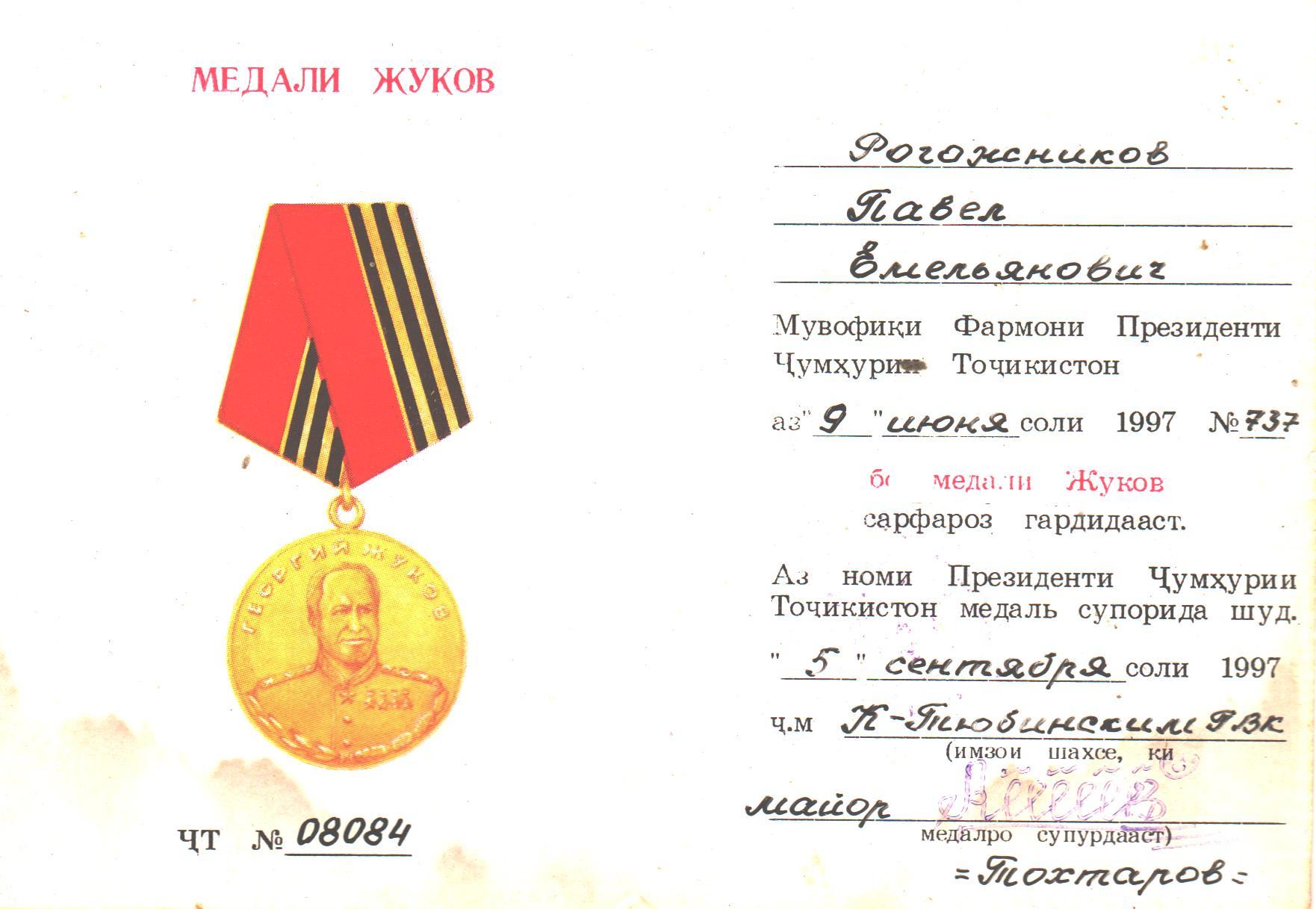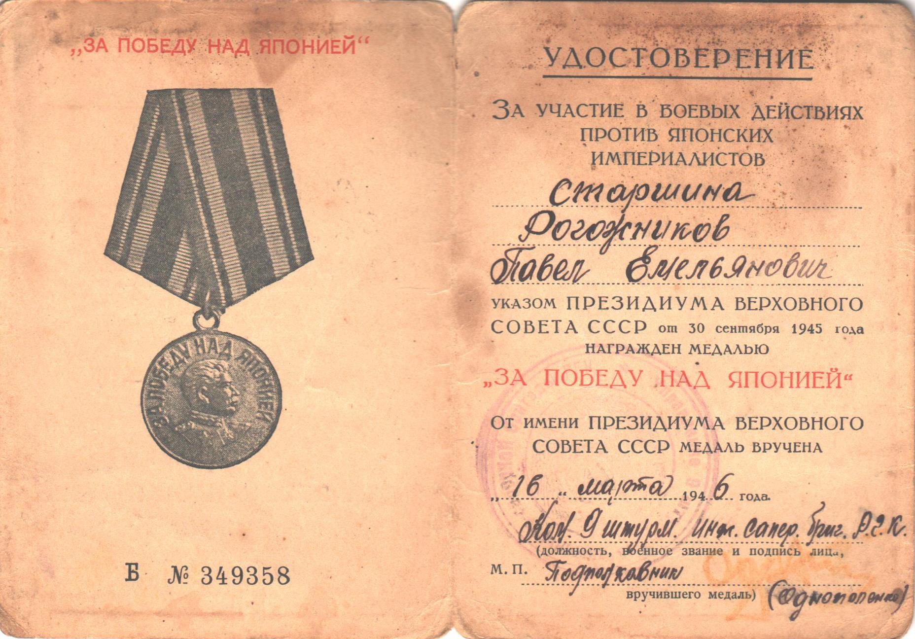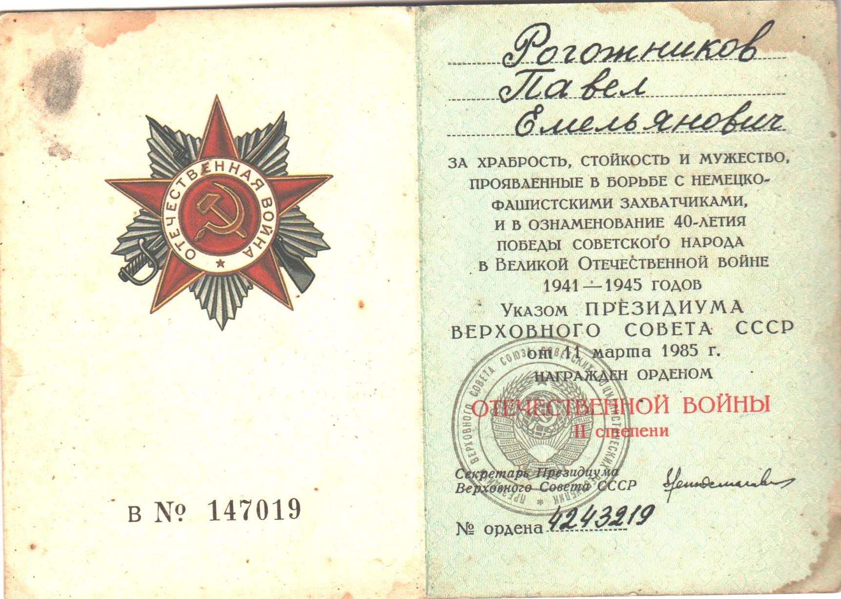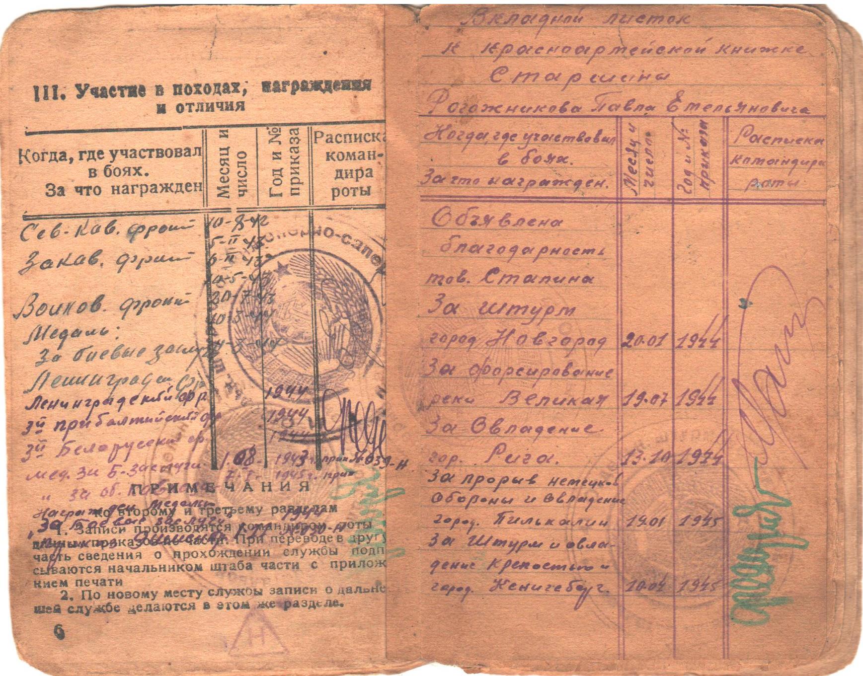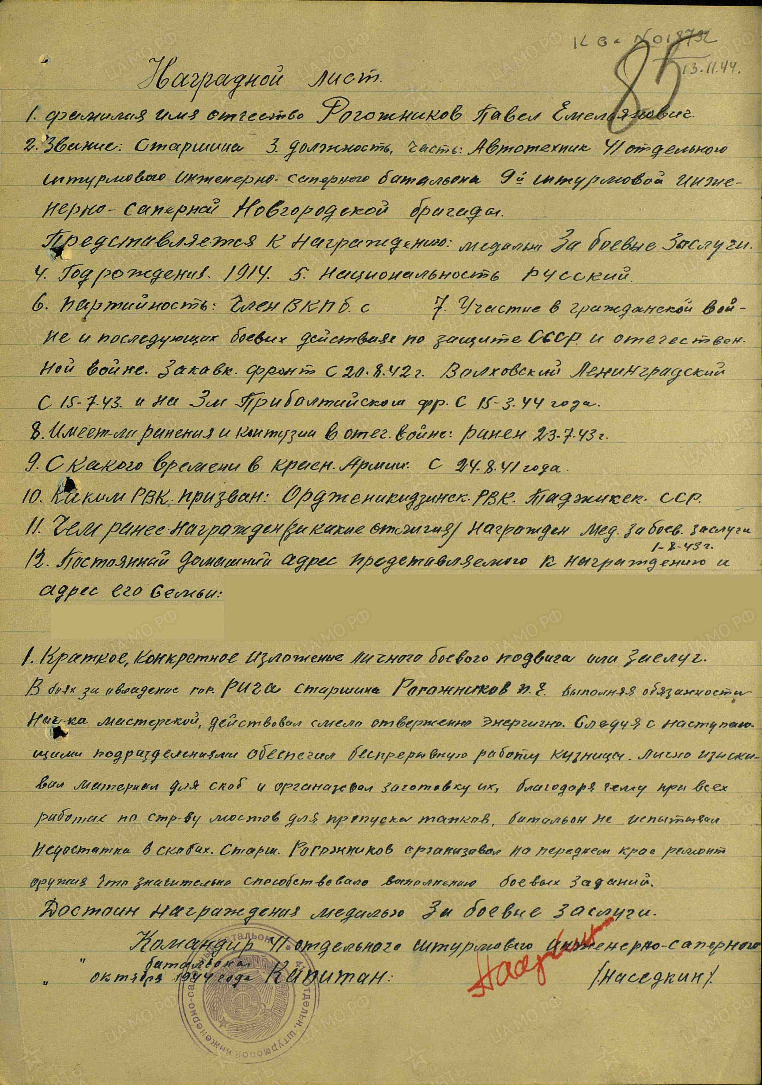 В боях за овладение г. Рига старшина Рогожников П.Е., выполняя обязанности начальника мастерской, действовал смело, самоотверженно, энергично. Следуя с наступающими подразделениями, обеспечил беспрерывную работу кузницы. Лично изыскивал материал для скоб и организовал их заготовку, благодаря чему на всех работах по строительству мостов для пропуска танков батальон не испытывал недостатка в скобах. Старшина Рогожников организовал на переднем крае ремонт оружия, что значительно способствовало выполнению боевых заданий. Достоин награждения медалью "За боевые заслуги" (наградной лист от 1.11.1944 г.).