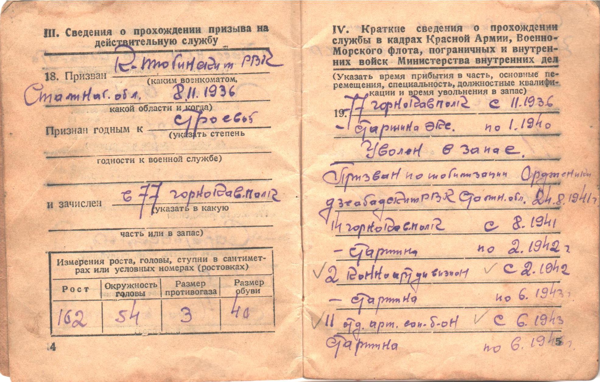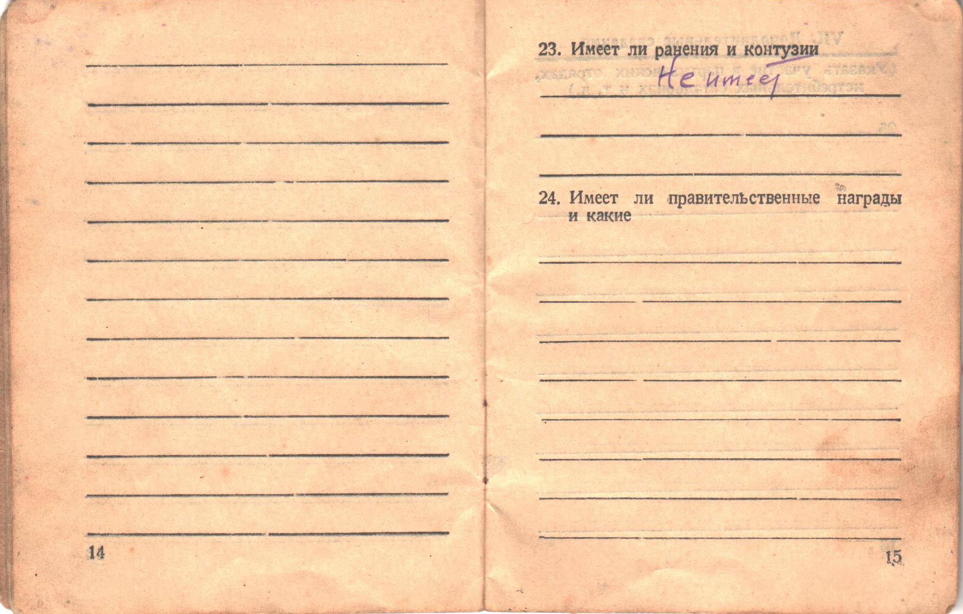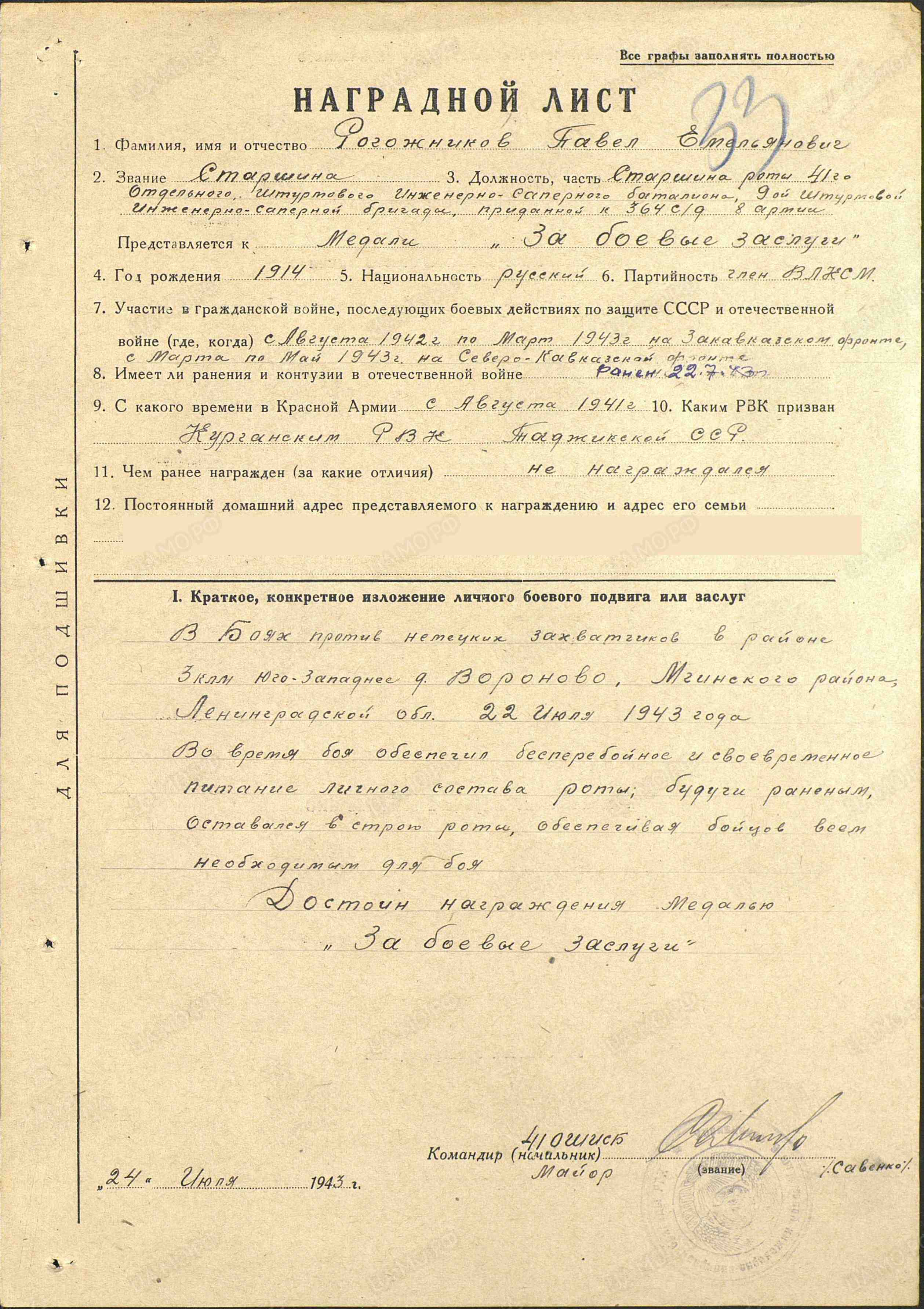 В боях против немецких захватчиков в районе 3 км юго-западнее д. Вороново Мгинского района Ленинградской области 22 июля 1943 г. обеспечил бесперебойное и своевременное питание личного состава роты. Будучи раненым, оставался в строю роты, обеспечивая бойцов всем необходимым для боя. Достоин награждения медалью "За боевые заслуги" (наградной лист от 24.07.1944 г.).