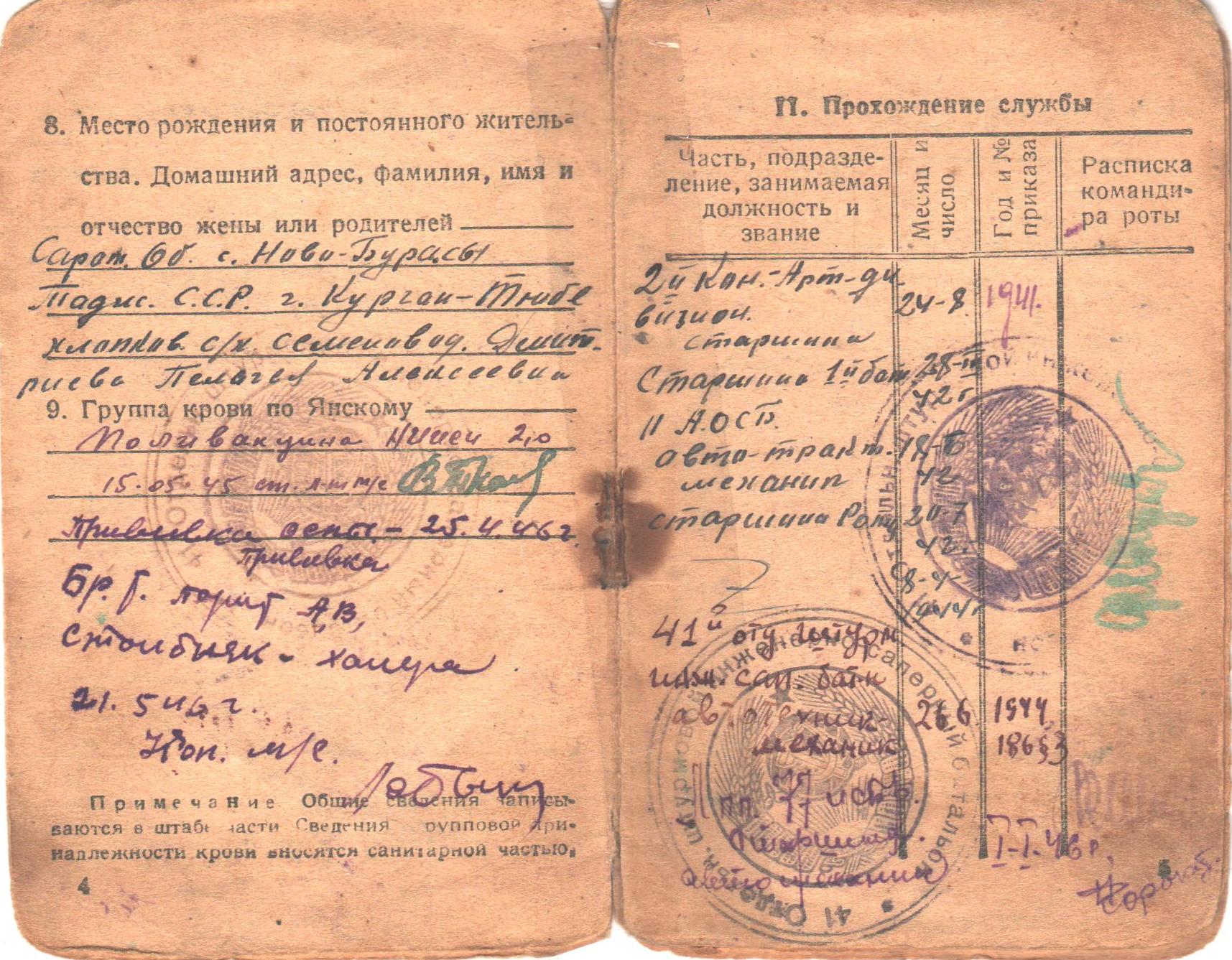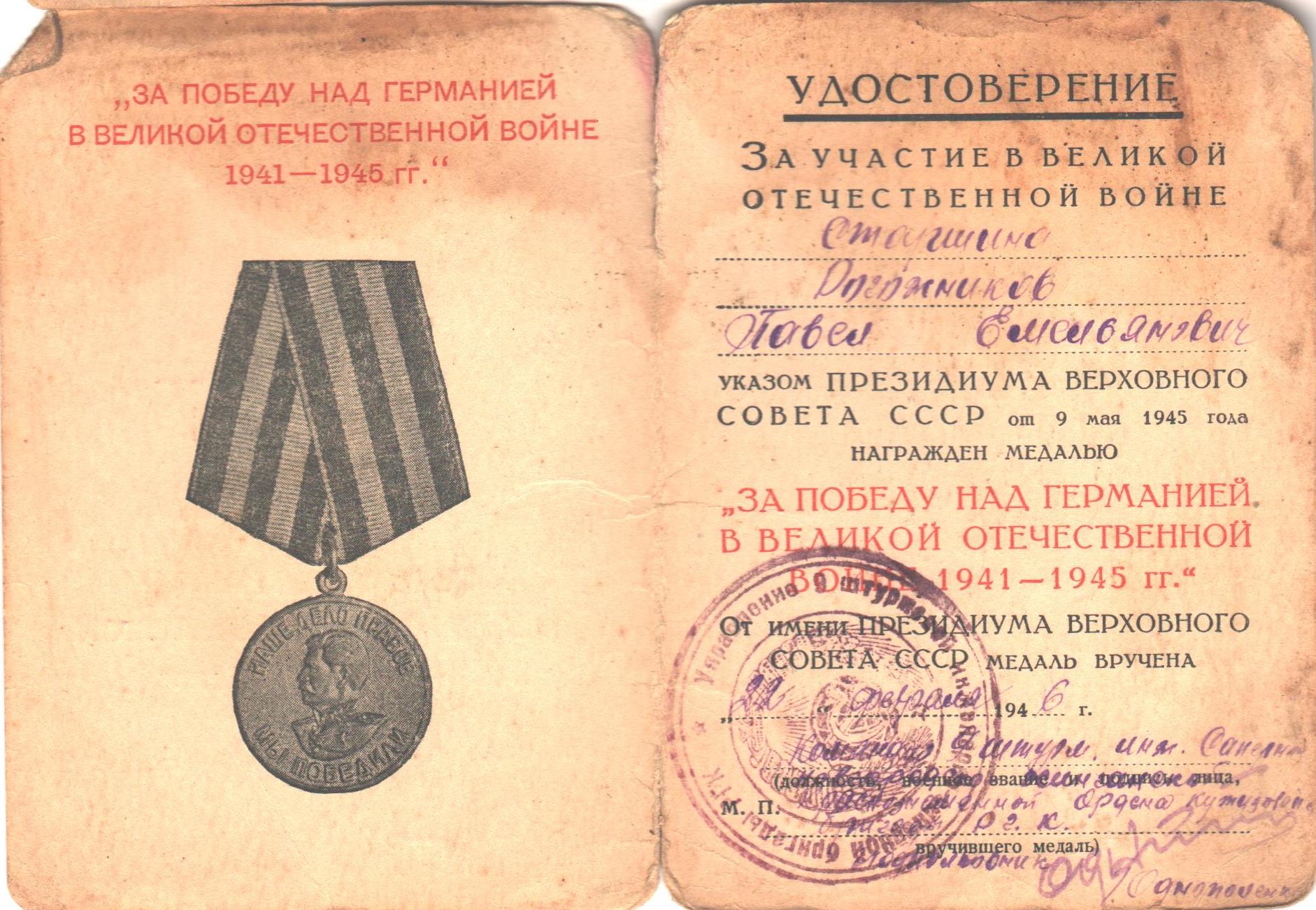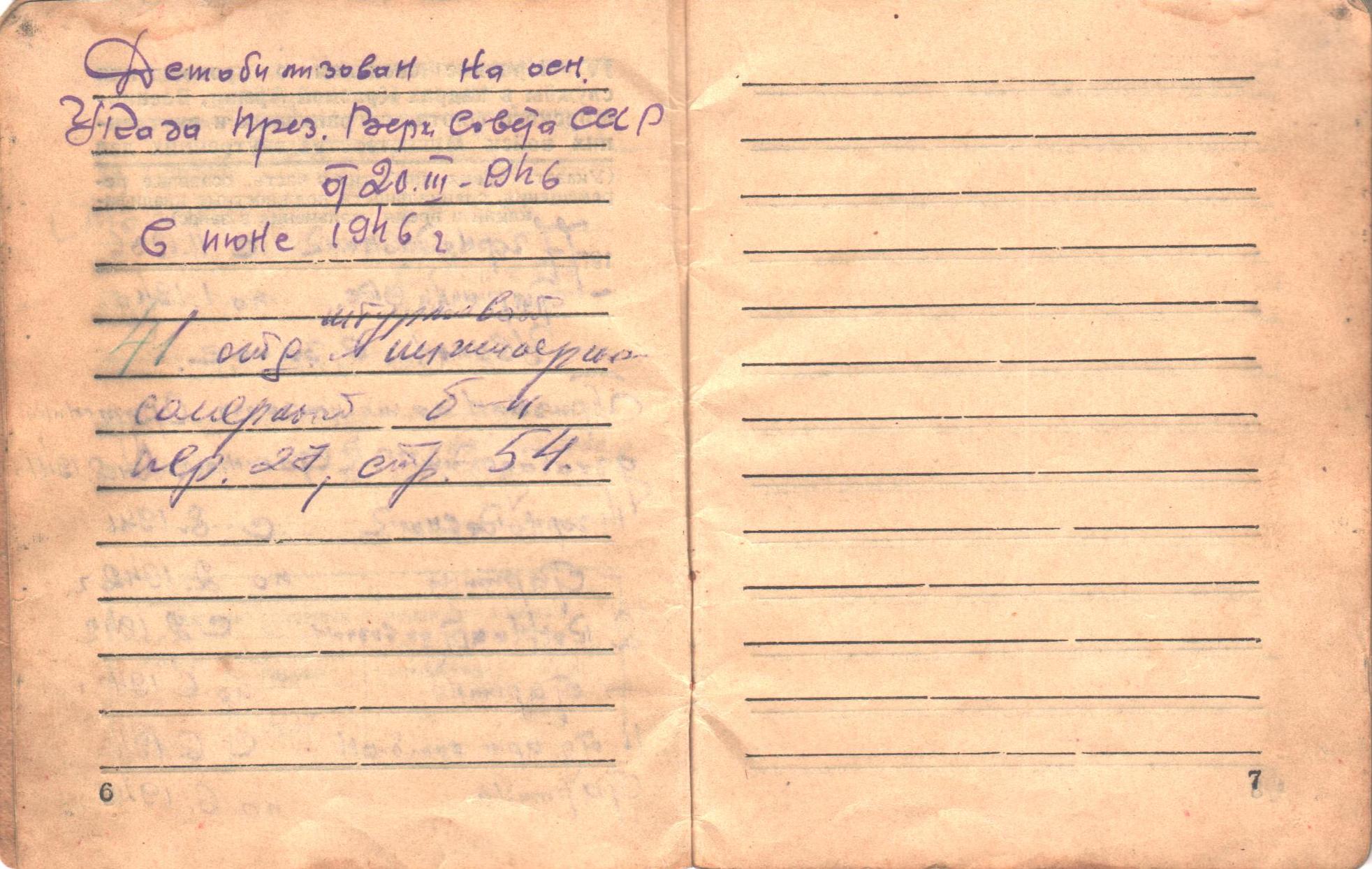 В боях против немецких захватчиков в районе 3 км юго-западнее д. Вороново Мгинского района Ленинградской области 22 июля 1943 г. обеспечил бесперебойное и своевременное питание личного состава роты. Будучи раненым, оставался в строю роты, обеспечивая бойцов всем необходимым для боя. Достоин награждения медалью "За боевые заслуги" (наградной лист от 24.07.1944 г.).