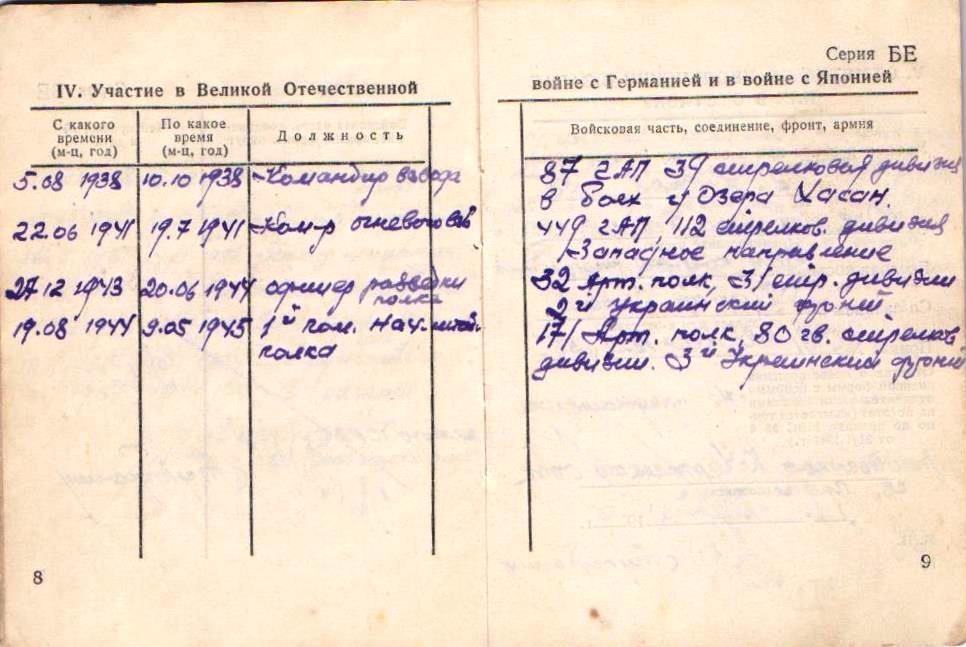 С 5 августа по 10 октября 1938 г. являлся командиром взвода в составе 39-й стрелковой дивизии, принимавшей участие в боях с японцами у озера Хасан.