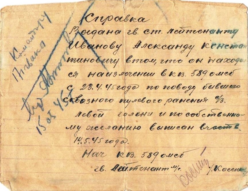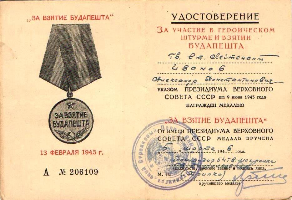В декабре 1944 г. Александр Константиновичполучил травму головы и был тяжело ранен в левую ногу. Участвовал в операциях по взятию Будапешта и Вены.