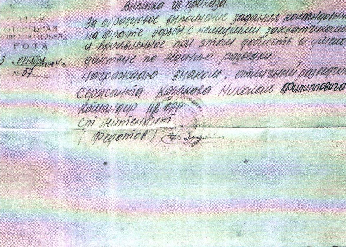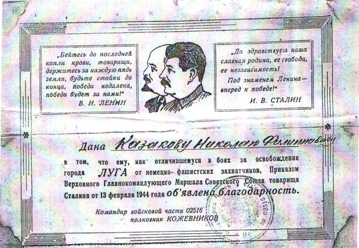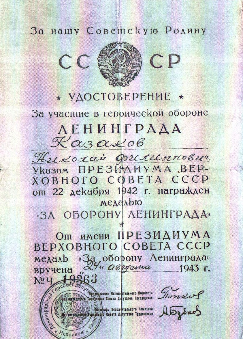 На начало войны Николай Филиппович находился в рядах Красной Армии в Карелии. Военная часть, в которой служил Н.Ф. Казаков, была переброшена на Ленинградский фронт, и когда кольцо блокады замкнулось, их часть базировалась в городе Ленинграде. Так начались 900 дней и ночей голода, холода, беспрерывных боёв.