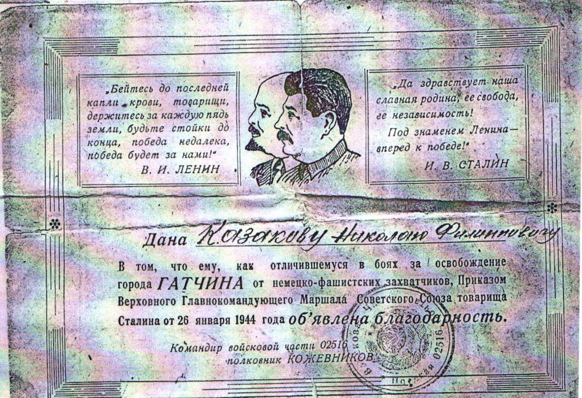 После снятия блокады участвовал в боях за освобождение Гатчины, Луги, Нарвы. В этот период командовал группами на разведке тыла противника. 26 января 1944 г. при разведке населённого пункта Воскресенское, командуя группой левого прикрытия, ворвался на окраину, овладел двумя домами и удерживал их до подхода пехоты.
