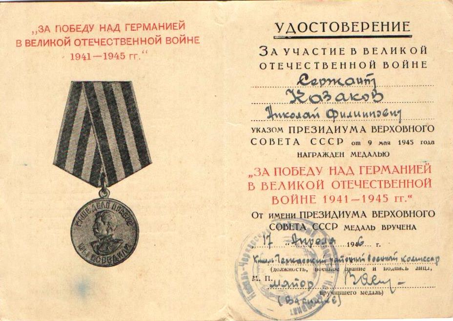 Материалы предоставлены из семейного архива снохой Татьяной Николаевной Казаковой, с. Кинель-Черкассы Кинель-Черкасского района Самарской области