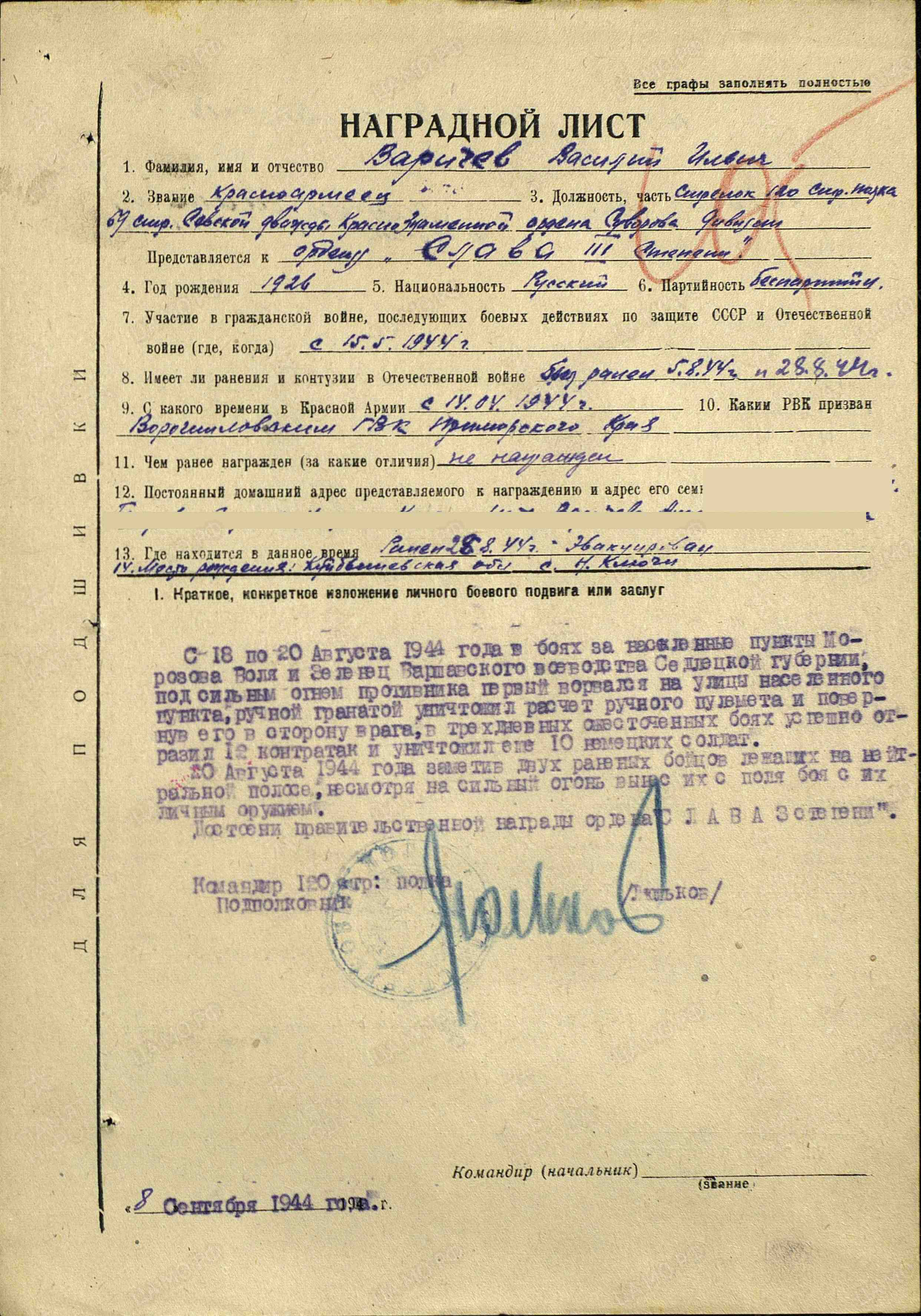 С 18 по 20 августа 1944 г. в боях за населенные пункты Морозова Воля и Зеленец Варшавского воеводства Седлецкой губернии (Польша), под сильным огнем противника первым ворвался на улицы населенного пункта. Ручной гранатой уничтожил расчет ручного пулемета и, повернув его в сторону врага, в трехдневных ожесточенных боях успешно отразил 12 контратак и уничтожил 10 немецких солдат. 20 августа 1944 г., заметив двух раненых бойцов, лежащих на нейтральной полосе, вынес их с поля боя с их личным оружием, несмотря на сильный огонь. Достоин правительственной награды - ордена Славы III степени (наградной лист от 8.09.1944 г.).