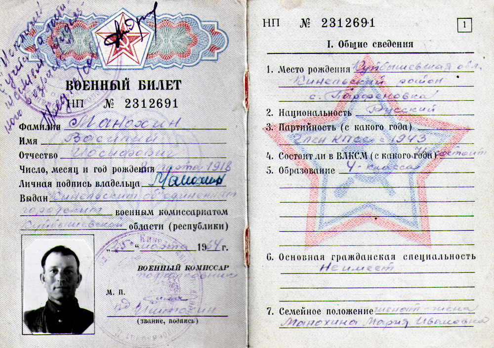 Василий Иосифович Манохин родился 8 марта 1918 года в селе Парфеновка Самарской губернии. Образование 4 класса.