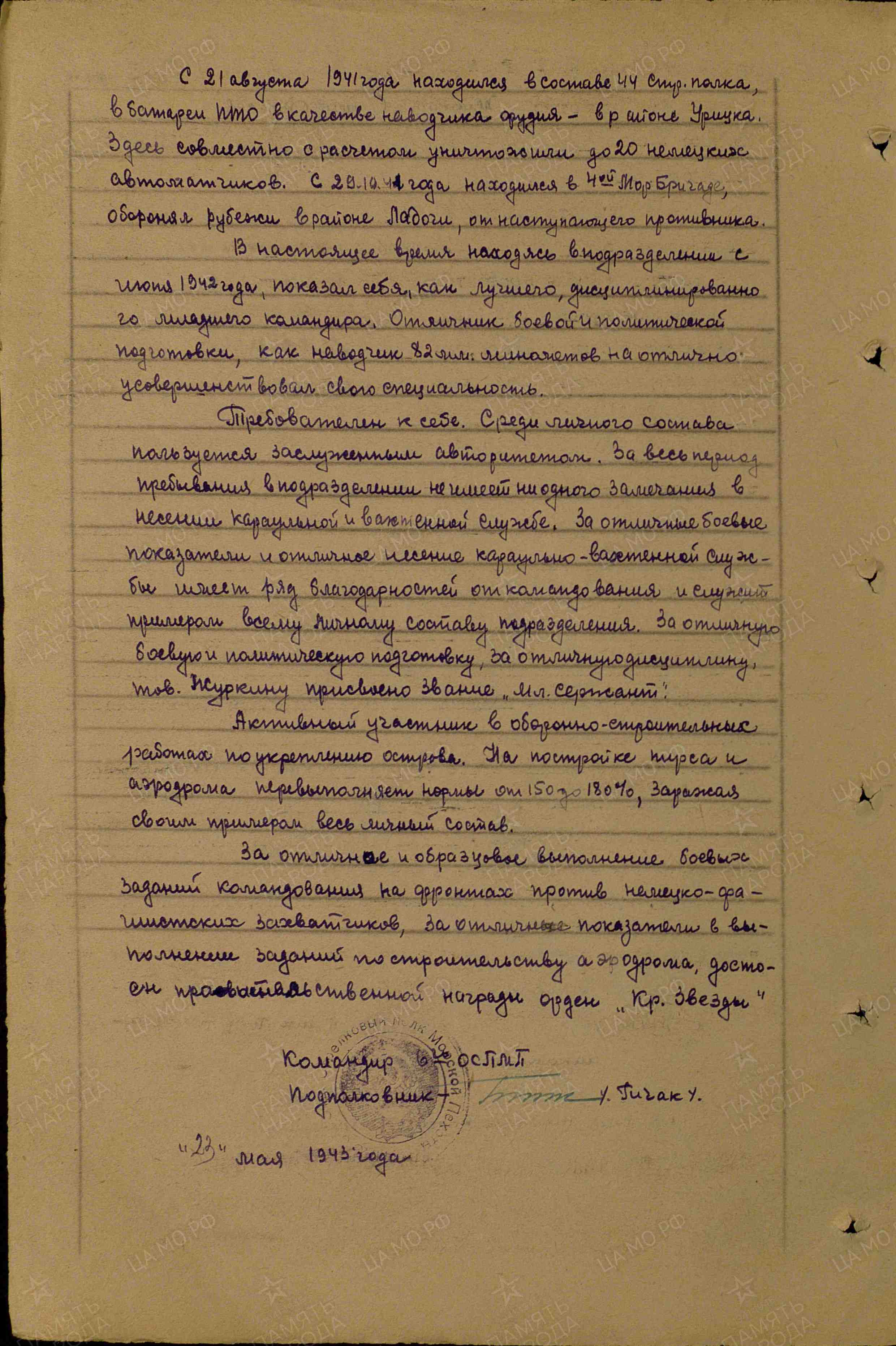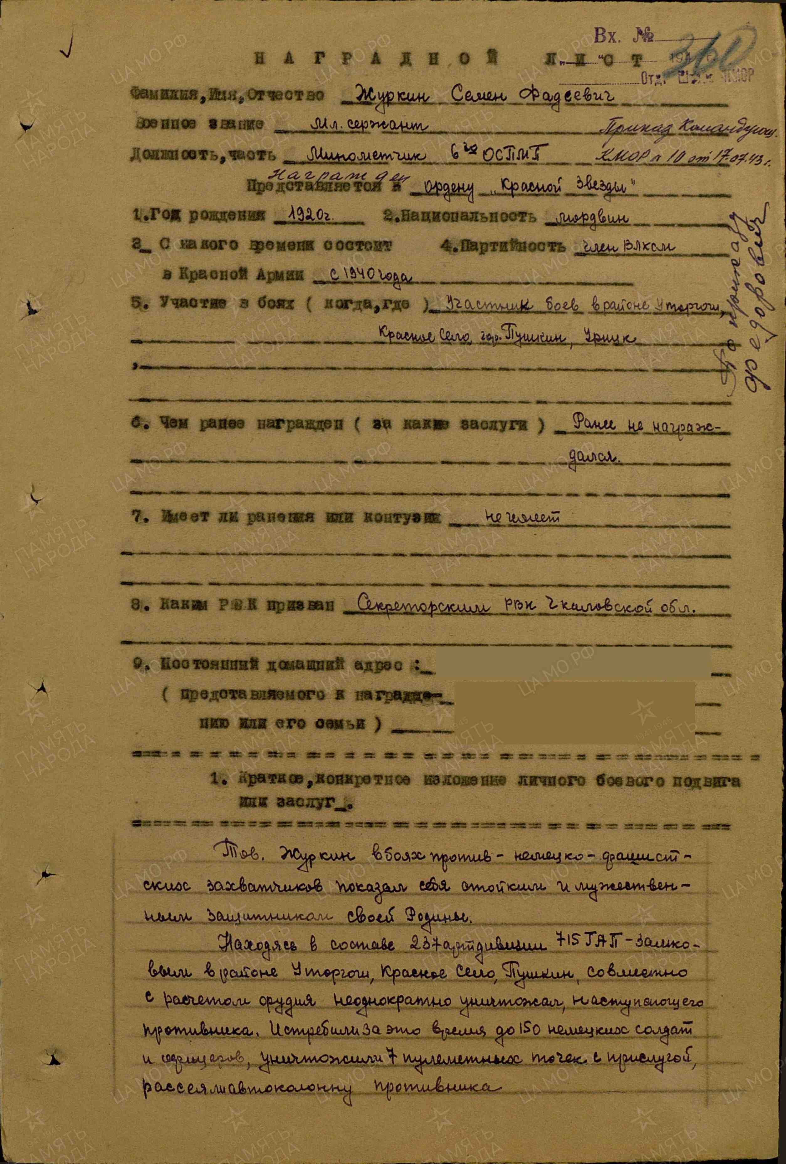 Тов. Журкин в боях против немецко-фашистских захватчиков показал себя стойким и мужественным защитником своей Родины. Находясь в составе 237-й артиллерийской дивизии 715 ГАП замковым, в районе Уторгош, Красное Село, Пушкин совместно с расчетом орудия неоднократно уничтожал наступающего противника. За это время истребили до 150 немецких солдат и офицеров, уничтожили 7 пулеметных точек с прислугой, рассеяли автоколонну противника. С 21 августа 1941 г. находился в районе г. Урицка в батарее противотанковых орудий в качестве наводчика орудия в составе 44-го стрелкового полка. Здесь совместно с расчетом уничтожили до 20 немецких автоматчиков. С 29 октября 1941 г. находился в 4-й морской бригаде, оборонял рубежи от наступающего противника в районе Ладоги. В настоящее время, находясь в подразделении с июня 1942 г., показал себя как лучшего, дисциплинированного младшего командира. Отличник боевой и политической подготовки. Как наводчик 82-мм минометов, на отлично усовершенствовал свою специальность. Требователен к себе. Среди личного состава пользуется заслуженным авторитетом. За весь период пребывания в подразделении не имеет ни одного замечания в несении караульной и вахтенной службы. За отличные боевые показатели и отличное несение караульно-вахтенной службы имеет ряд благодарностей от командования и служит примером всему личному составу подразделения. За отличную боевую и политическую подготовку, за отличную дисциплину тов. Журкину присвоено звание «младший сержант». Активный участник оборонно-строительных работ по укреплению острова. На постройке пирса и аэродрома перевыполняет нормы от 150 до 180%, заражая своим примером весь личный состав. За отличное и образцовое выполнение боевых заданий командования на фронтах против немецко-фашистских захватчиков, за отличные показатели в выполнении заданий по строительству аэродрома достоин правительственной награды - ордена Красной Звезды (наградной лист от 23.05.1943 г.).