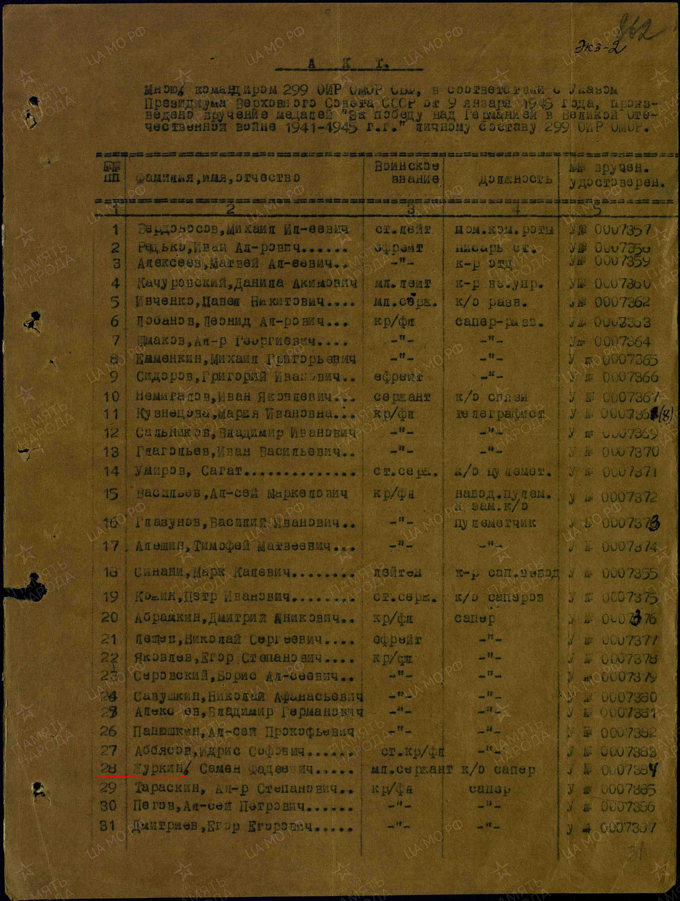 Наградной лист: