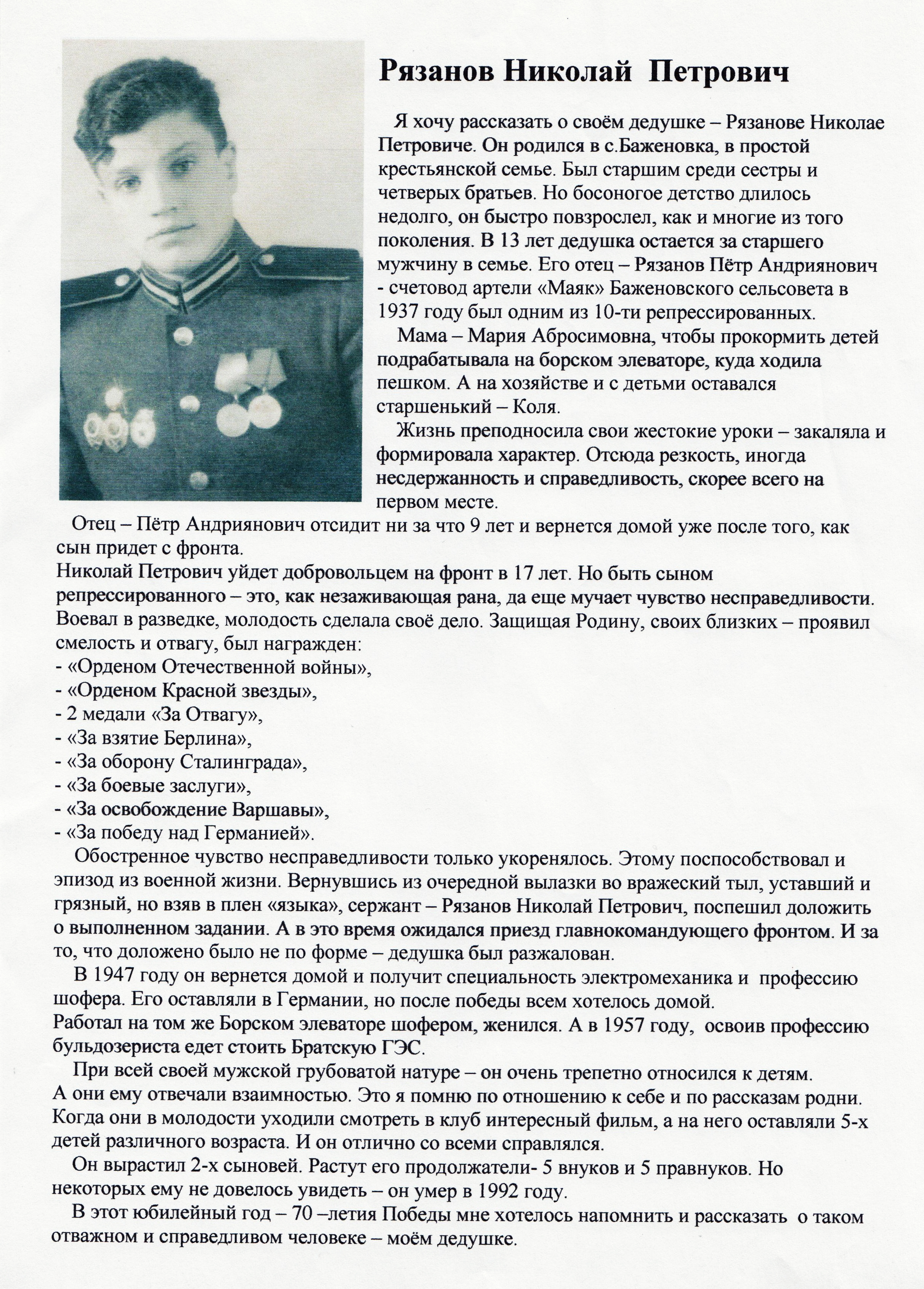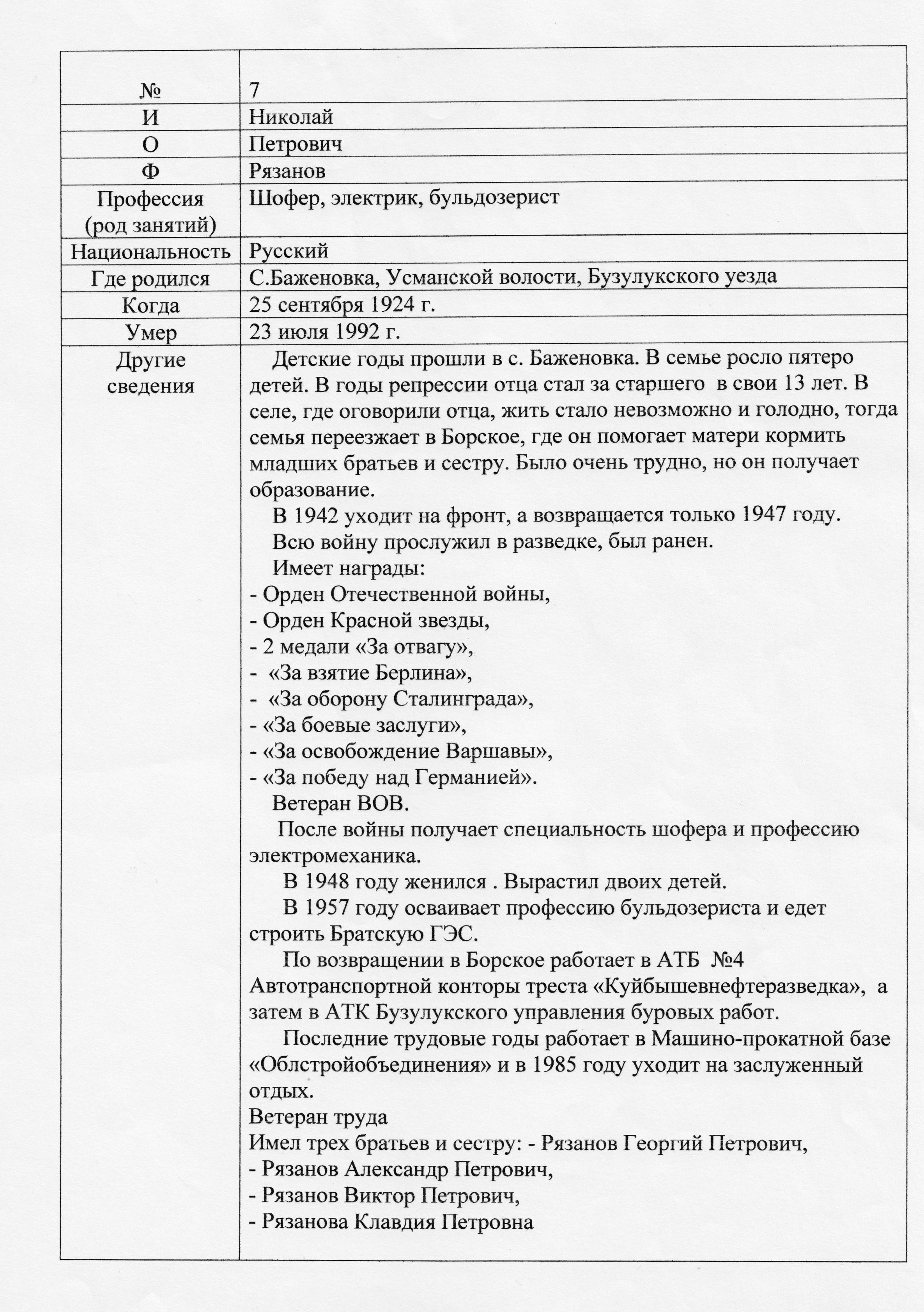 Николай Петрович Рязанов родился 25 сентября 1924 года в селе Баженовка Усманской волости Бузулукского уезда (ныне Борский район Самарской области).