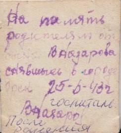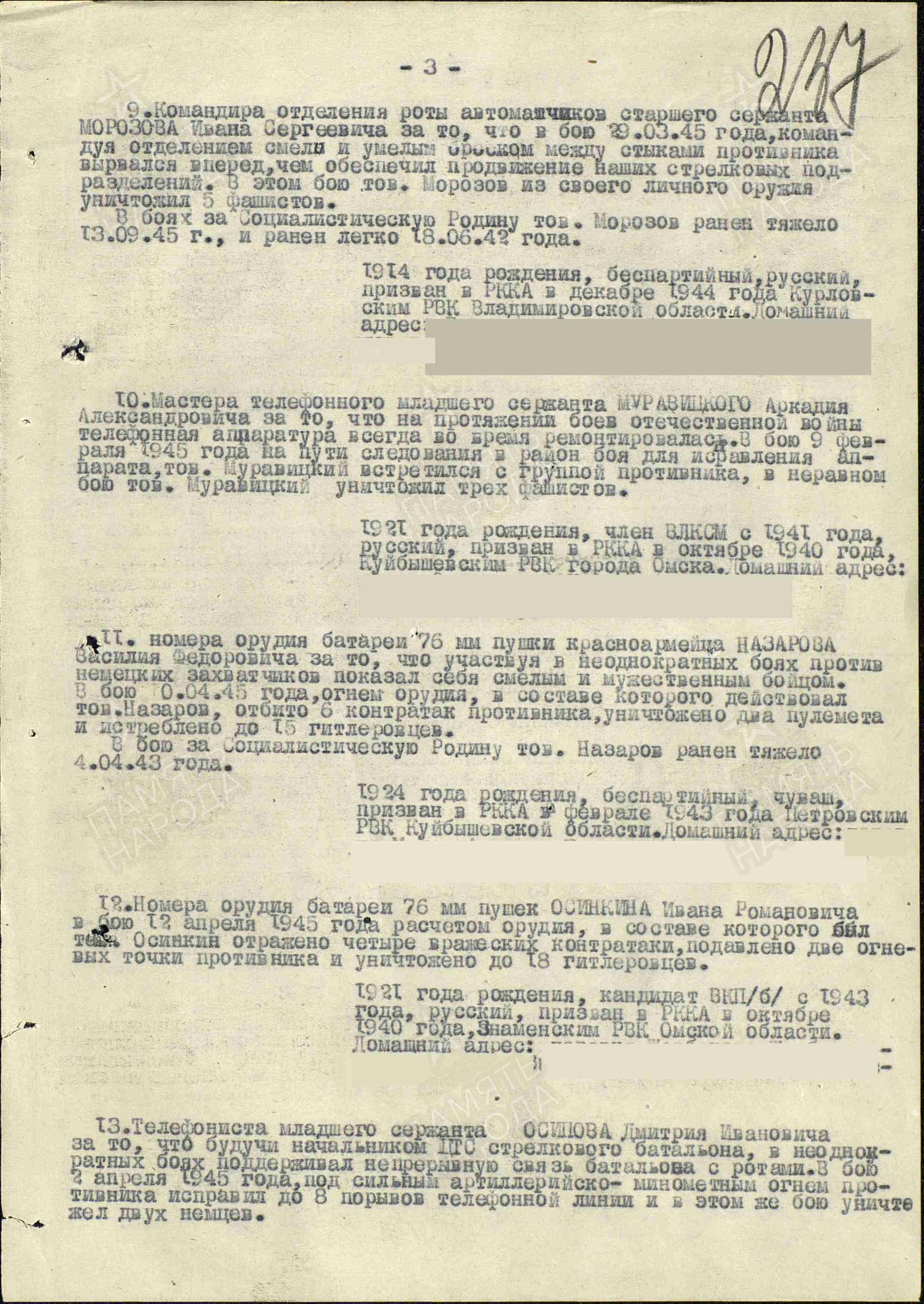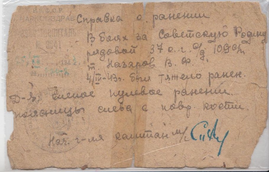 Наградить медалью "За отвагу" номера орудия 76-мм батареи красноармейца Назарова Василия Федоровича за то, что участвуя в неоднократных боях против немецких захватчиков, показал себя смелым и мужественным бойцом. В бою 10 апреля 1945 г. огнем орудия, в составе которого действовал тов. Назаров, отбито 6 контратак противника, уничтожено 2 пулемета и истреблено до 15 гитлеровцев. В бою за Социалистическую Родину тов. Назаров был тяжело ранен 4 апреля 1943 г. (приказ от 16.05.1945 г.).