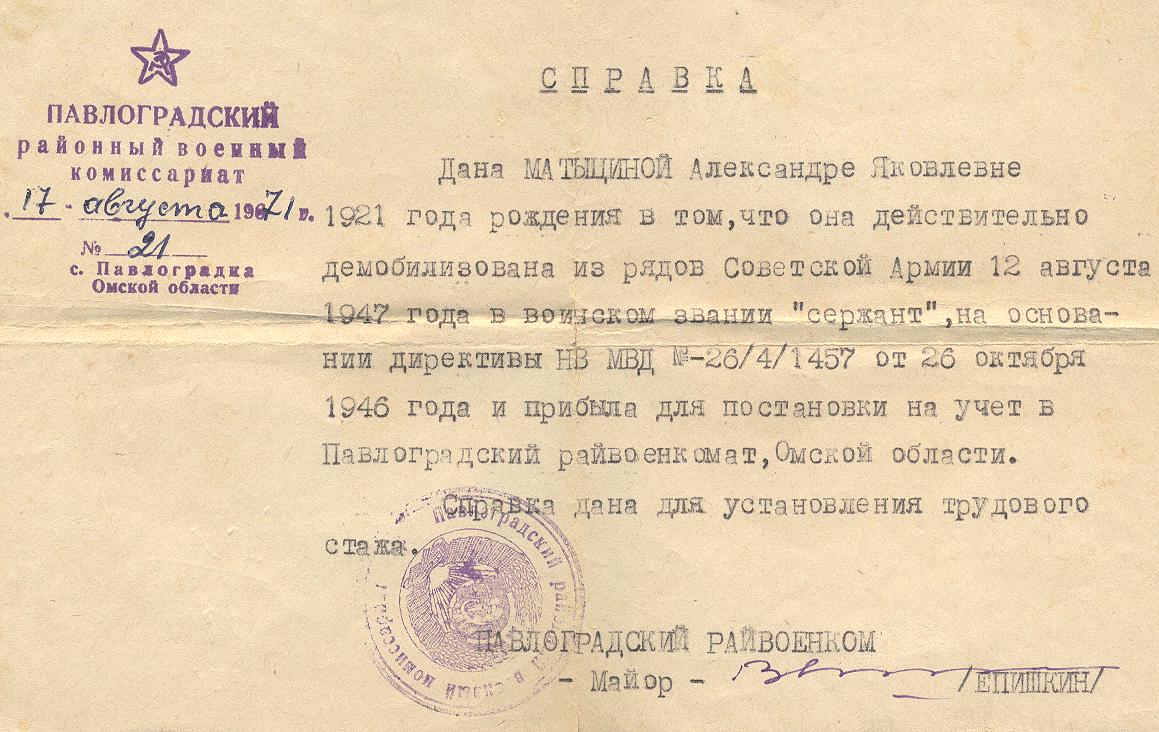 Здесь Александра познакомилась с Иваном Захаровичем Колесником, за которого вышла замуж в 1947 г. После Победы, вместе с мужем, вернулась в Алексеевку. На 82-м году жизни переехала жить в село Тростянка Богатовского района к дочери.