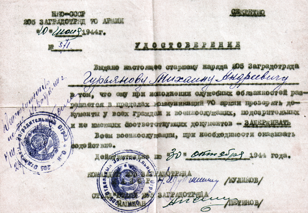 После выхода из госпиталя Михаил Андреевич был направлен в 205-й заградительный отряд (ноябрь 1943 г.), затем в Резерв Главного Политического управления Советской Армии (июнь 1945 г.).