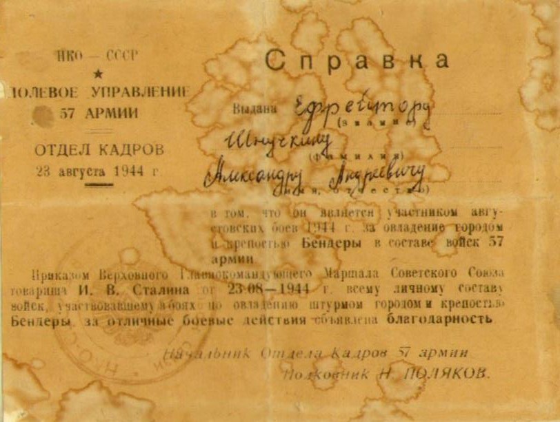 Приказом Верховного Главнокомандующего Маршала Советского Союза товарища Сталина от 23.08.1944 г. всему личному составу войск, участвовавшему в боях по овладению штурмом и городом крепостью Бендеры за отличные боевые действия объявлена благодарность.