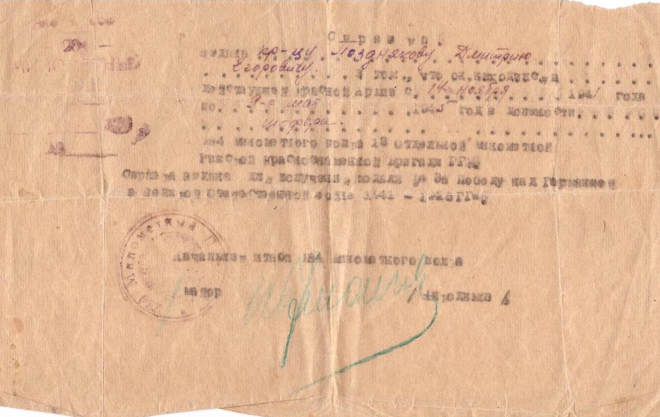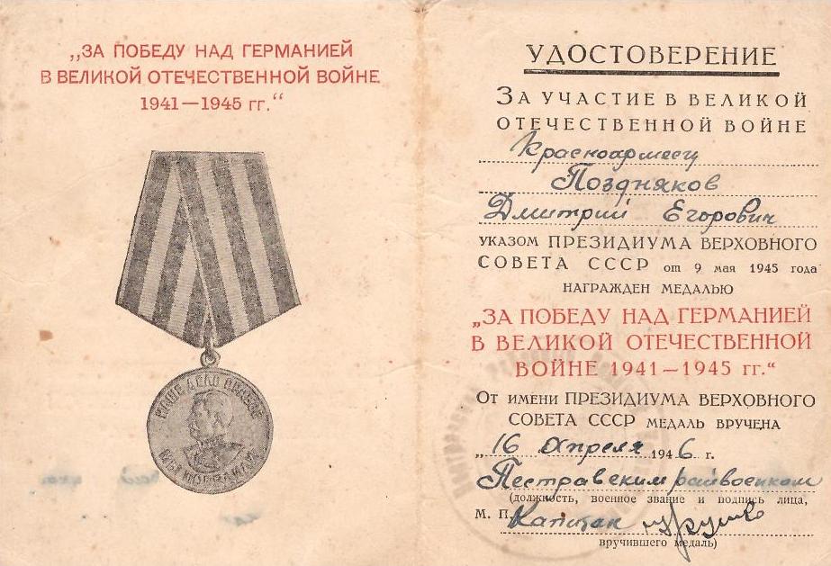 «В боях с немецкими захватчиками с 10 июля по 20 августа 1944 г. шофер Поздняков неоднократно подвергался артобстрелу и авиабомбёжке противника, но бесперебойно обеспечивал подвоз боеприпасов, матчасти и людей в разные огневые позиции, чем способствовал успешному выполнению боевых задач. Автомашина всегда содержится в боевой готовности» (награжден медалью «За отвагу», 20.08.1944 г.).