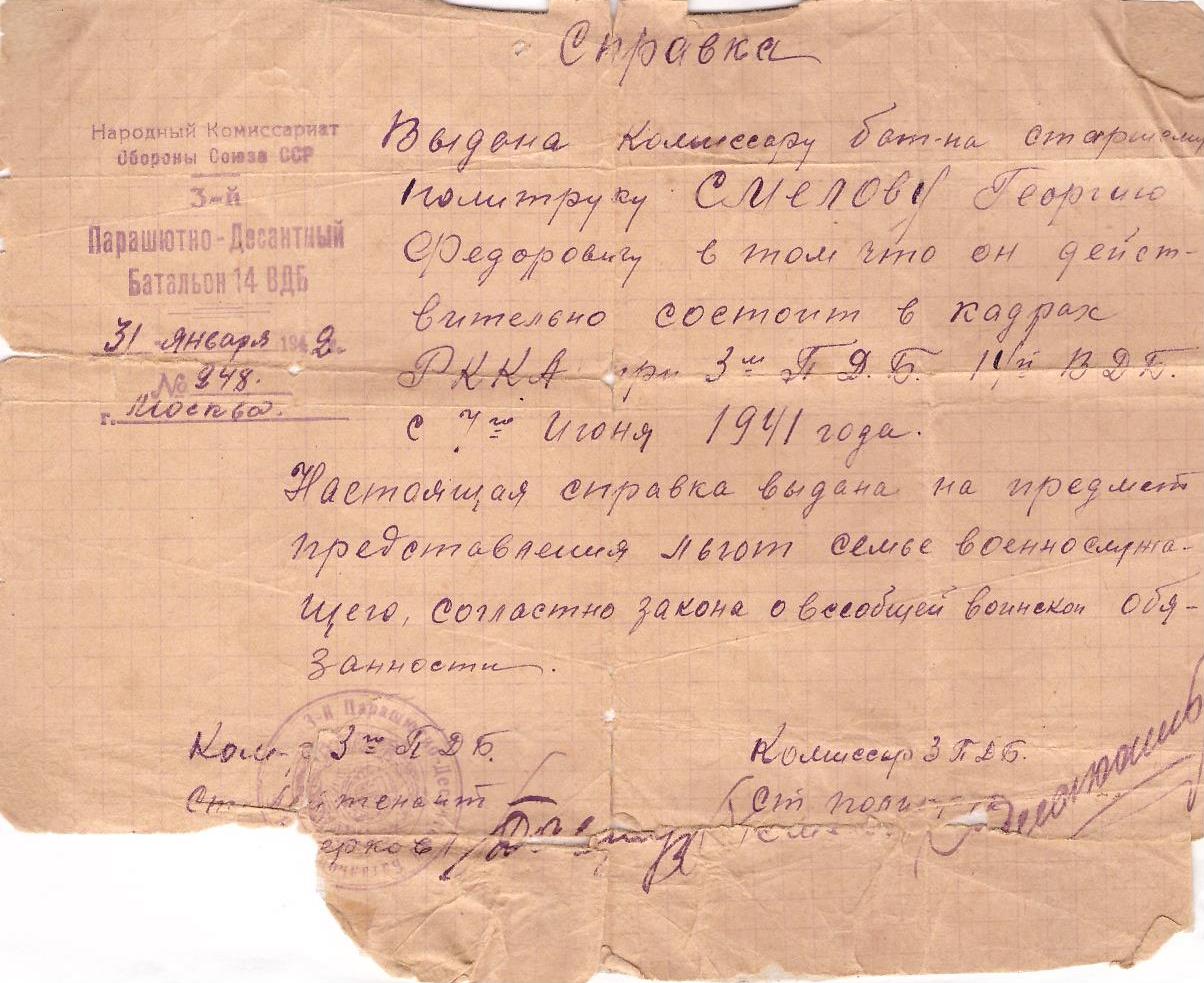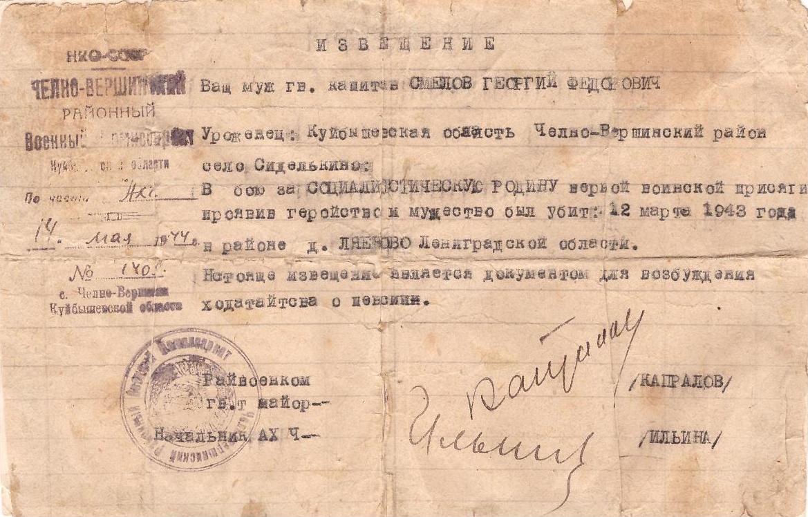 12 марта 1943 года Георгий Федорович Смелов погиб в Ленинградской области.