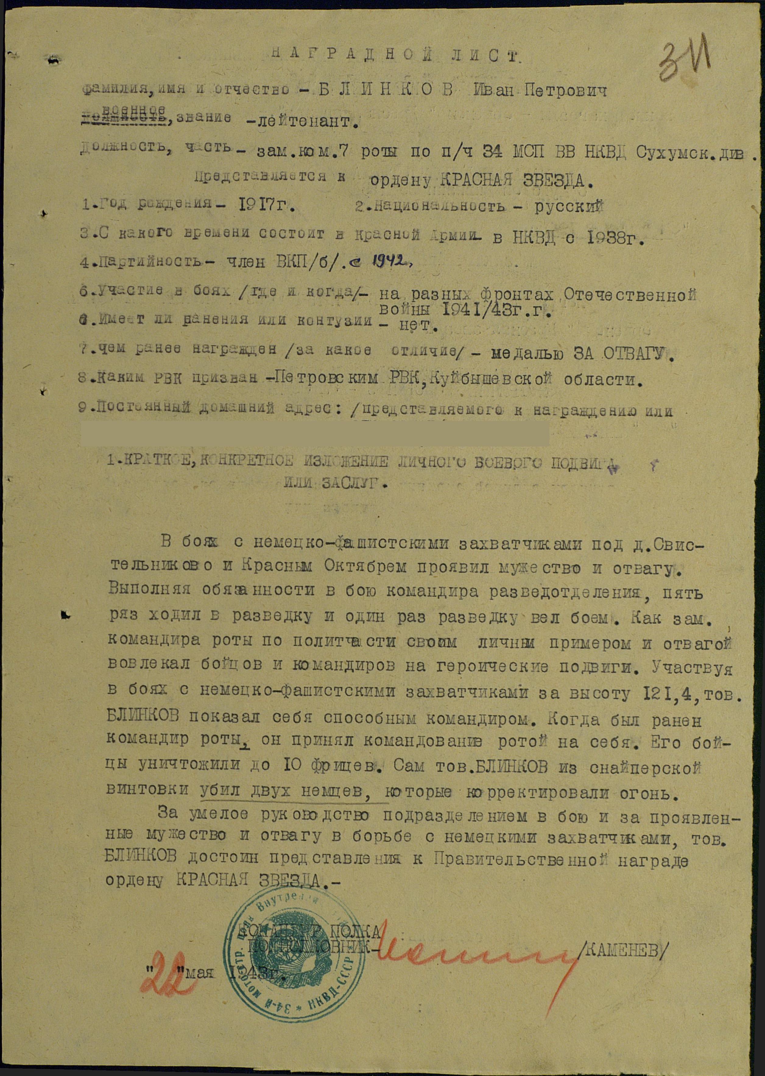 Весной 1943 года, в районе хуторов Свистельниково и Красный Октябрь, это в Краснодарском крае, бои были кровопролитными и ожесточенными, населенные пункты по несколько раз переходили из рук в руки. «Немцы заняли гору и вели огонь из всех видов оружия по нашим войскам, попытки поразить огонь противника и выбить немцев с удобной позиции были безрезультатными. При каждой атаки гибло много бойцов, так как они для немцев были видны как на ладони. После многодневного противостояния нашим войскам удалось овладеть этой высотой, и фашисты были вынуждены отступить. Гора была синего цвета от цветущих васильков, поэтому это противостояние было названо «Голубой линией». После отступления немцы взорвали все строения и дома в хуторах. Самая страшная картина открылась возле силосной ямы, которая была превращена в могилу, в ней были трупы наших солдат, стариков, женщин и детей. Эта страшная картина не забудется никогда, вся дальнейшая военная судьба оставила в памяти не больше места, чем эта битва». О битве за высоту, на которой мирно цвели васильки, рассказывал и прадедушка моему папе, когда он был примерно моего возраста. Я очень удивился, что воспоминания папы пересекаются с выпиской из найденного на сайте наградного листа на Блинкова И.П.: «в боях с немецко-фашистскими захватчиками под д. Свистельниково и Красным Октябрем проявил мужество и отвагу. Выполнял обязанности в бою командира разведотделения, пять раз ходил в разведку и один раз разведку вел боем. Как зам. командира роты по политчасти своим личным примером и отвагой вовлекал бойцов и командиров на героические подвиги. Участвуя в боях с немецко-фашистскими захватчиками за высоту 121.4, тов. Блинков показал себя способным командиром. Когда был ранен командир роты, он принял командование ротой на себя. Его бойцы уничтожили до 10 фрицев. Сам тов. Блинков из снайперской винтовки убил двух немцев, которые корректировали огонь». Приказом № 010/н от 06.06.1943 г. по Сухумской дивизии ВВ НКВД Северо-Кавказского фронта, за умелое руководство подразделением в бою и за проявленное мужество и отвагу в борьбе с немецкими захватчиками, лейтенант Блинков И.П. награжден орденом Красной Звезды.