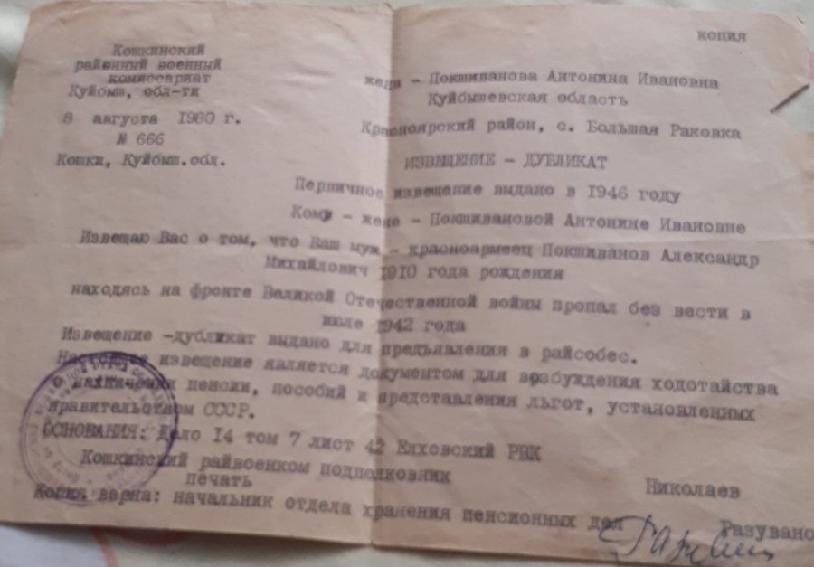 В 1946 году его супруга Антонина Ивановна Покшиванова получила на него похоронку.