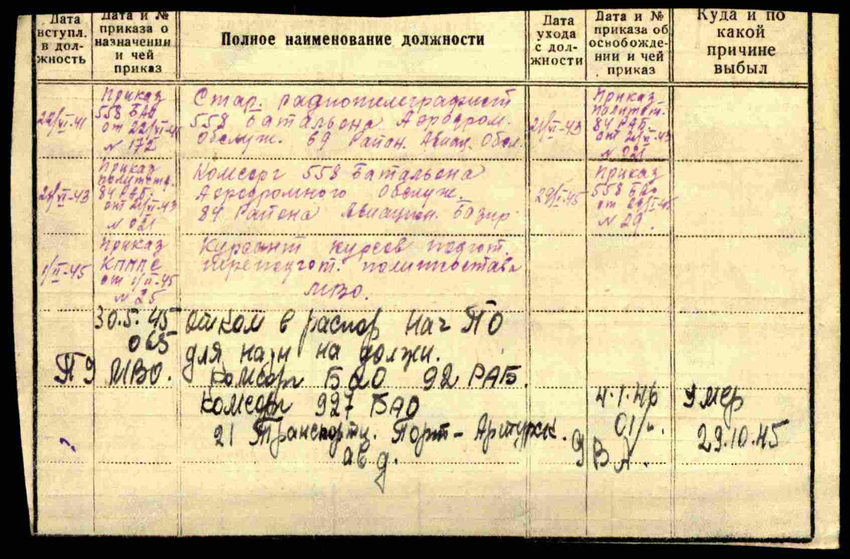 Младший лейтенант, участник Великой Отечественной войны. В сентябре 1939 г. был призван на фронт. Принимал участие в боевых операциях Забайкальского фронта против империалистической Японии в составе 927-го батальона аэродромного обслуживания 21-й гвардейской транспортной авиационной дивизии, комсорг. Выполняя обязанности начальника клуба, организовывал досуг личного состава дивизии.