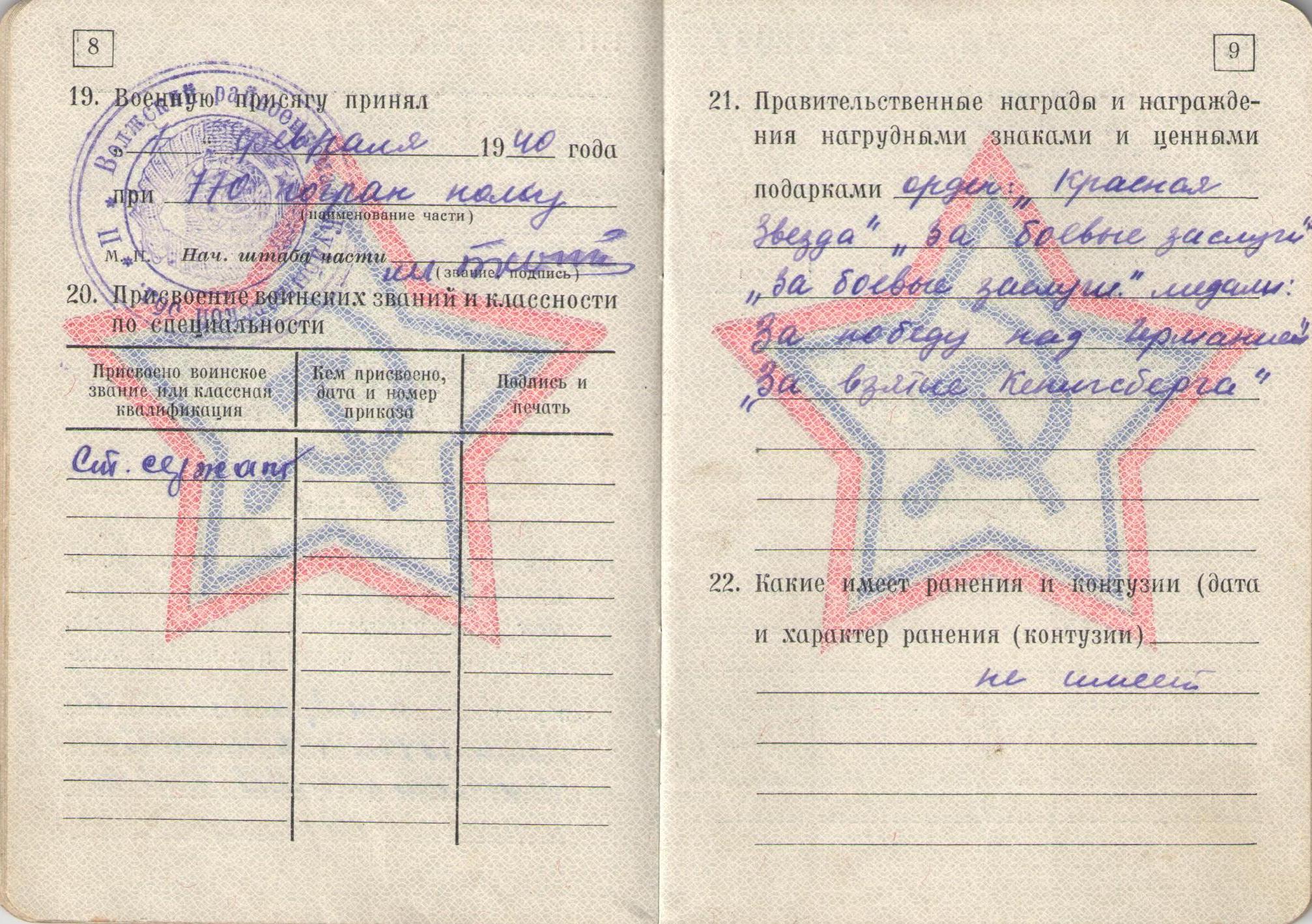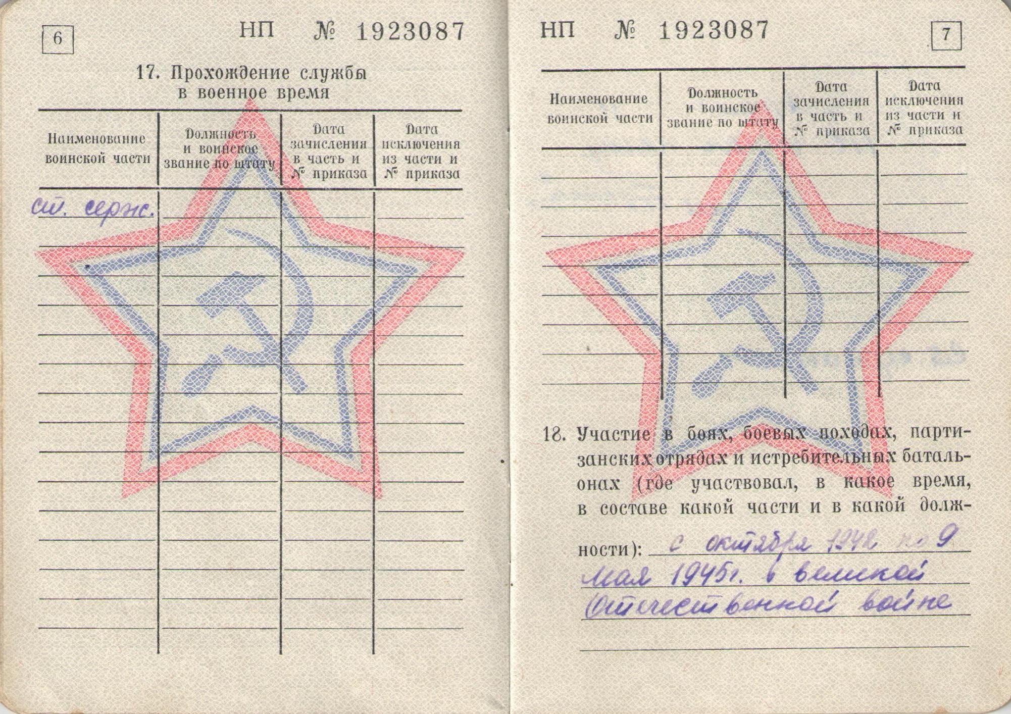 Начинал службу в Красной Армии в 1940 г., в погранвойсках на Амуре. В 1942 г. был переброшен на Центральный фронт. В составе 102-й стрелковой дивизии участвовал в сражении на Курско-Орловской дуге, находился в артиллерийской разведке. Воевал на Белорусском фронте, под Бобруйском, выстоял в жестоком бою. Лицо его тогда было сильно изранено осколками. Отвоевывал Минск, освобождал Кенигсберг.