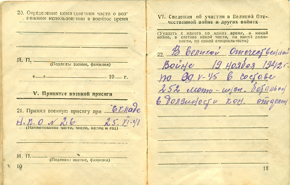 23 июня 1941 г. был мобилизован на защиту Родины от немецких захватчиков. Участвовал в боевых действиях в составе 252-го мотоинженерного батальона 57-й армии в должности командира отделения с 19 ноября 1942 по 9 мая 1945 г.