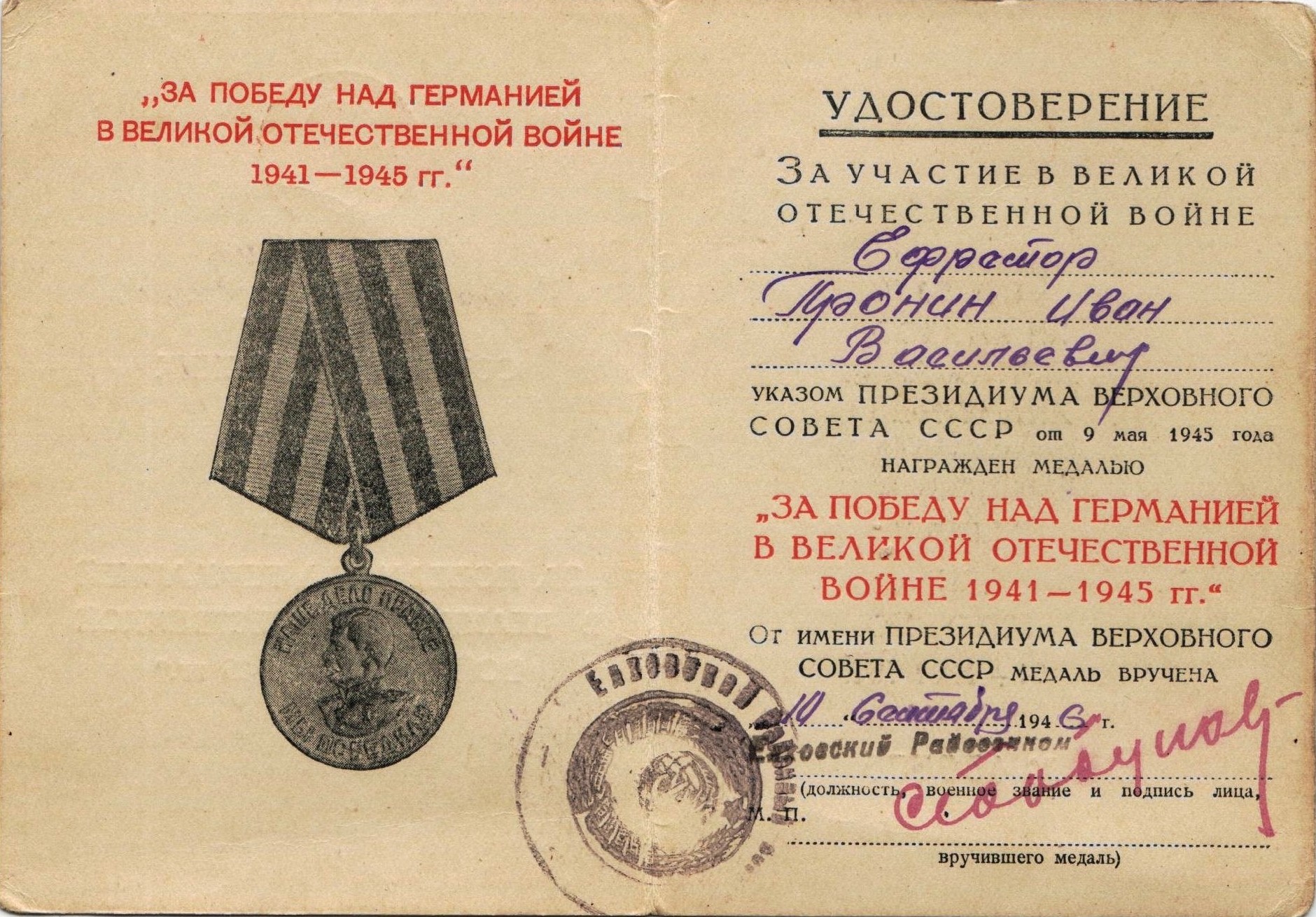 Иван Васильевич Пронин родился в 1925 году в селе Малая Каменка.